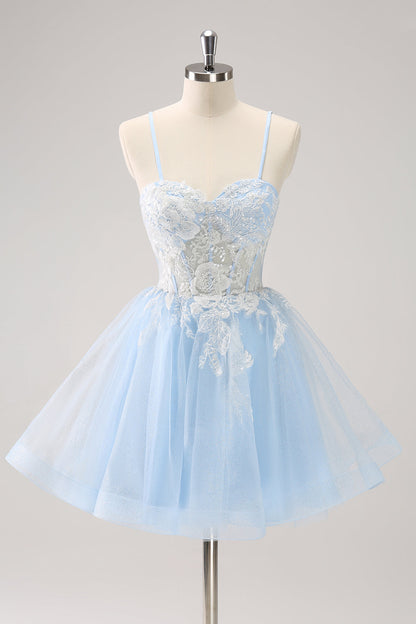 Blue A Line Spaghetti Straps Short Homecoming Dress with Appliques