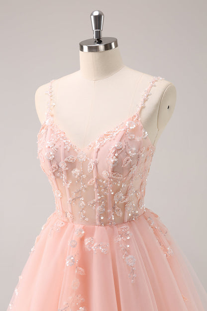 A Line Blush Spaghetti Straps Tulle Corset Sequins Homecoming Dress with Appliques