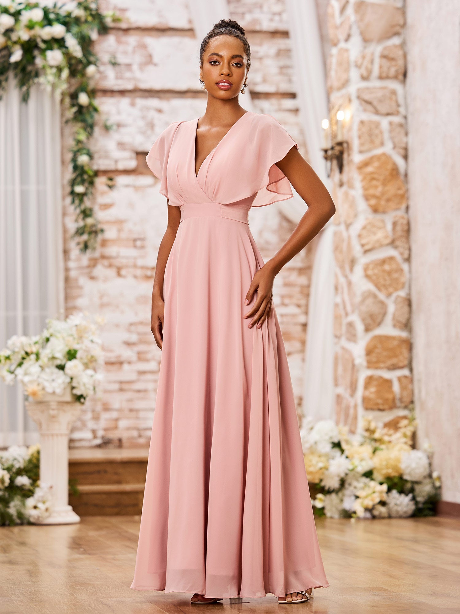 • This A-line chiffon dress is a chic and sophisticated choice, featuring a deep V-neckline, delicate cap sleeves, and a floor-length design that creates a stunning silhouette. With its ruched, belted, and bow-adorned details, this dress is perfect for a formal event or a special occasion.