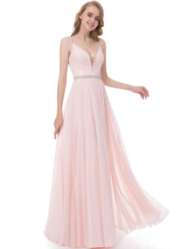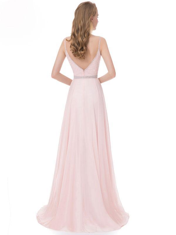 A-line Spaghetti Strap Floor-Length Chiffon Beaded Pink Prom Dress