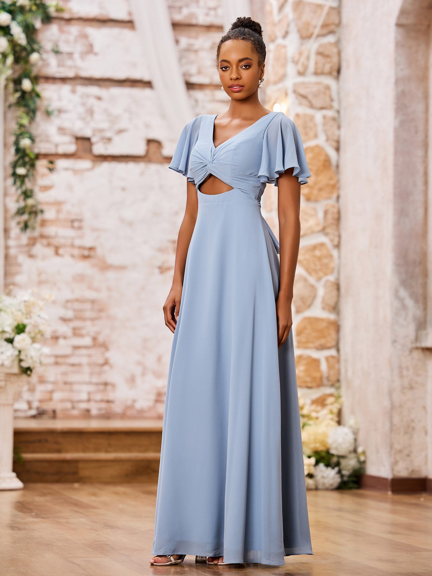 A-line V-neck Chiffon Long Dresses with Cap Sleeves Dusty Blue