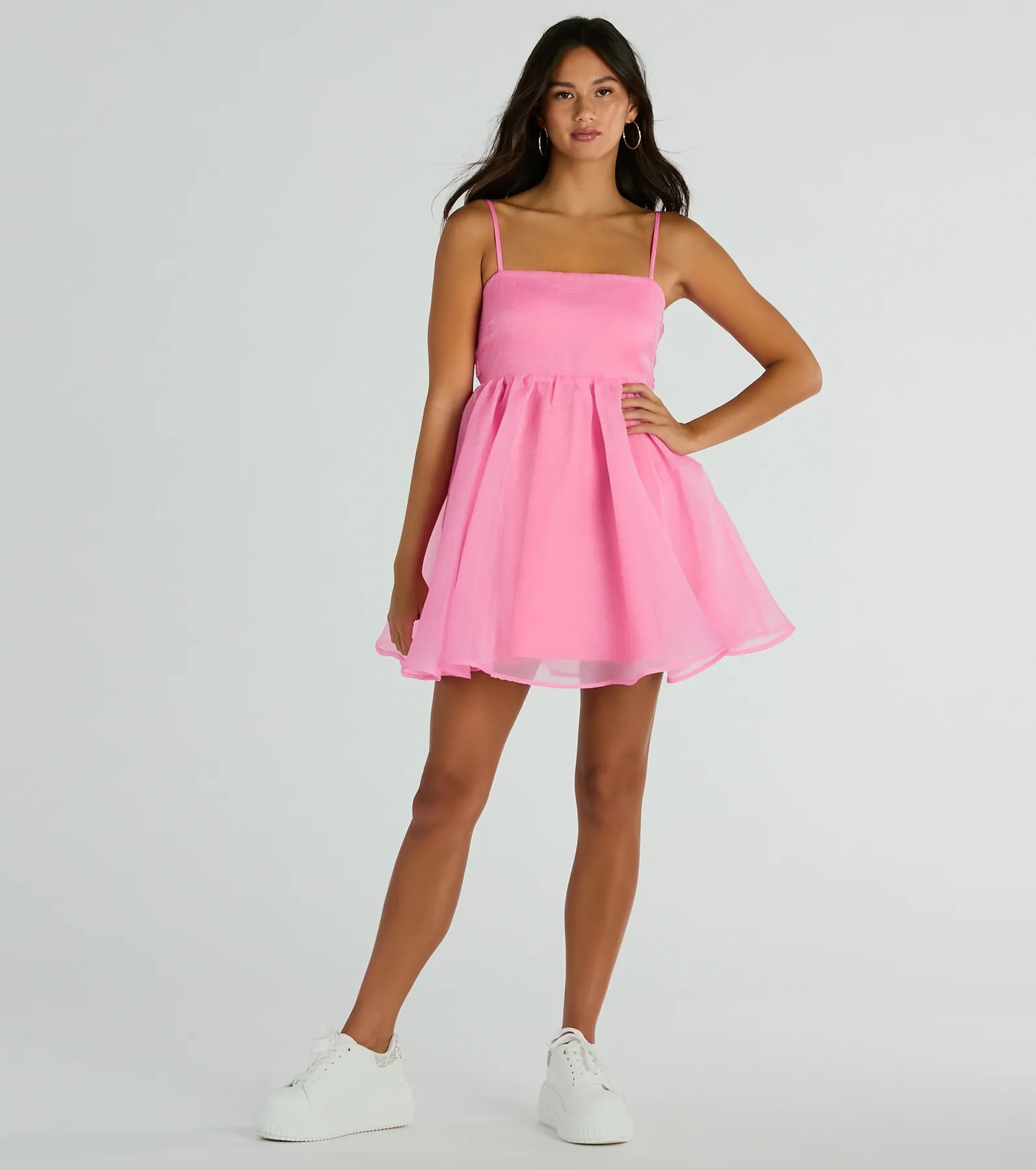 Everyone will know you're the babe of the hour in this sleeveless babydoll dress at parties and celebrations! Featuring a square neckline, adjustable spaghetti straps, and a stretchy smocked back adorned with a cute bow tie. The babydoll silhouette, mini-length hem on organza woven fabric will have you feeling confident and playful!