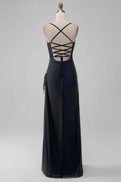 Back Blue Mermaid Spaghetti Straps Long Bridesmaid Dress with Slit