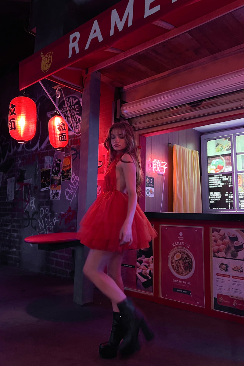 The Beatrice Backless Halter Babydoll Dress is complete with tulle layering and a cinched waist. Available in cream and blood orange.