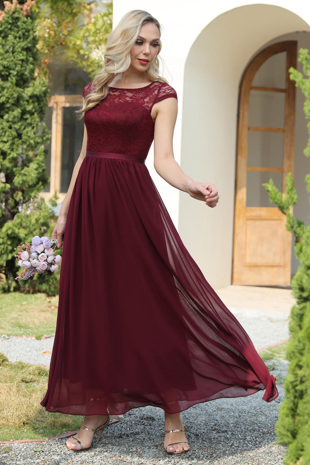 Burgundy Cap Sleeves Chiffon Bridesmaid Dress