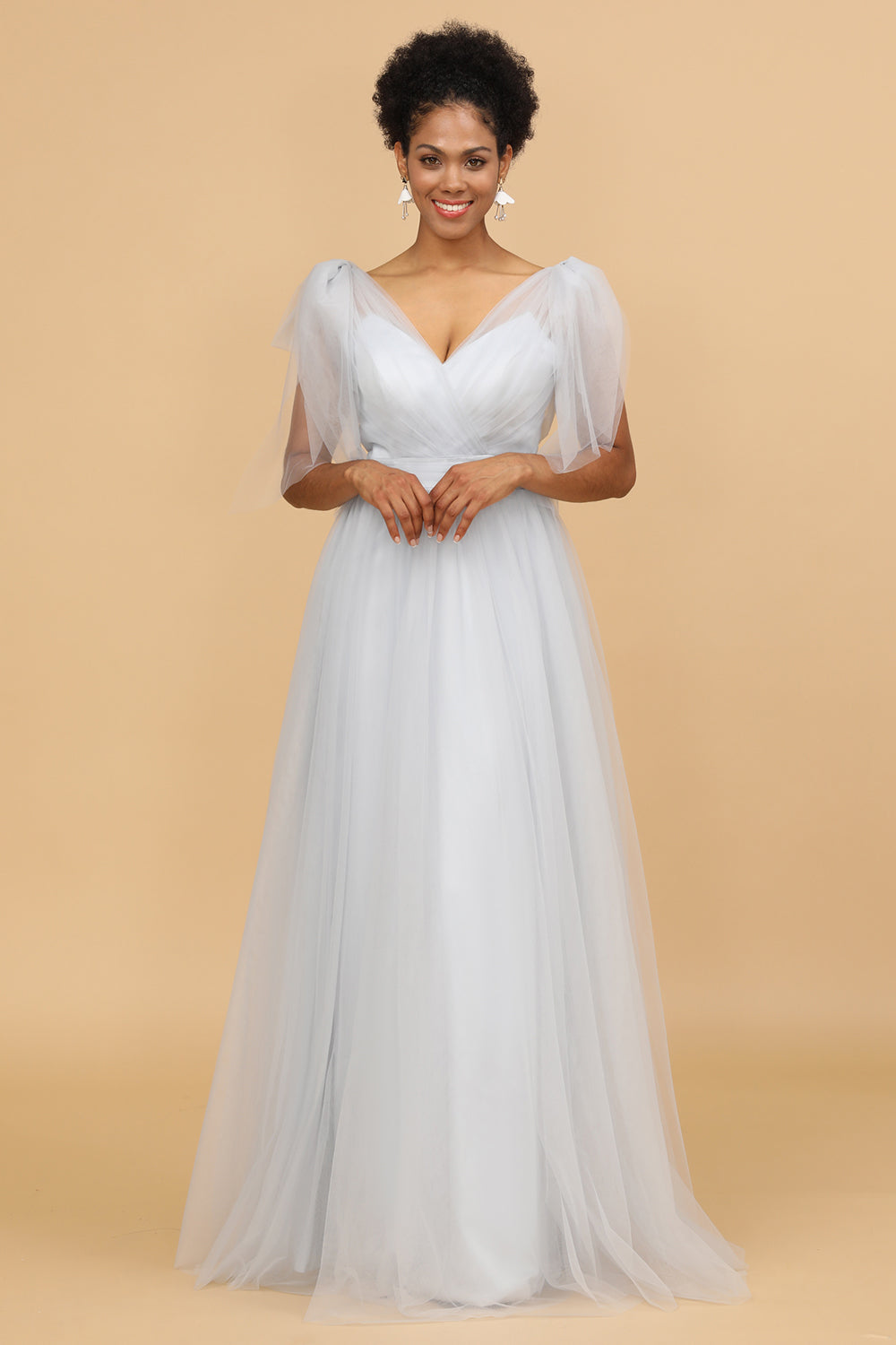 V-neck Grey Tulle Long Bridesmaid Dress