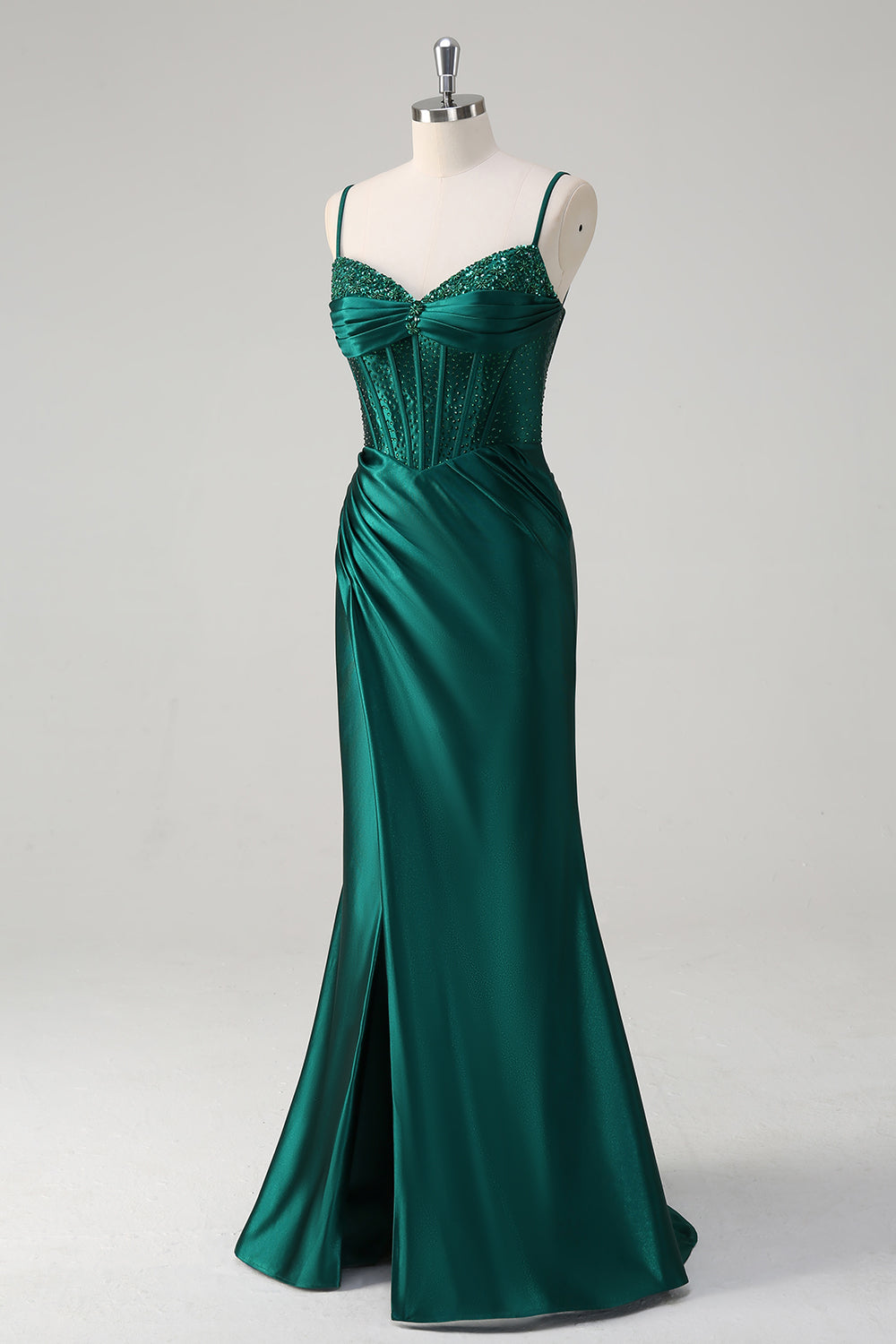Dark Green Mermaid Sequined Spaghetti Straps Long Prom Dress with Slit