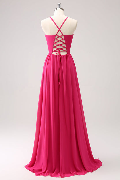 Fuchsia Spaghetti Straps Chiffon Long Bridesmaid Dress with Slit