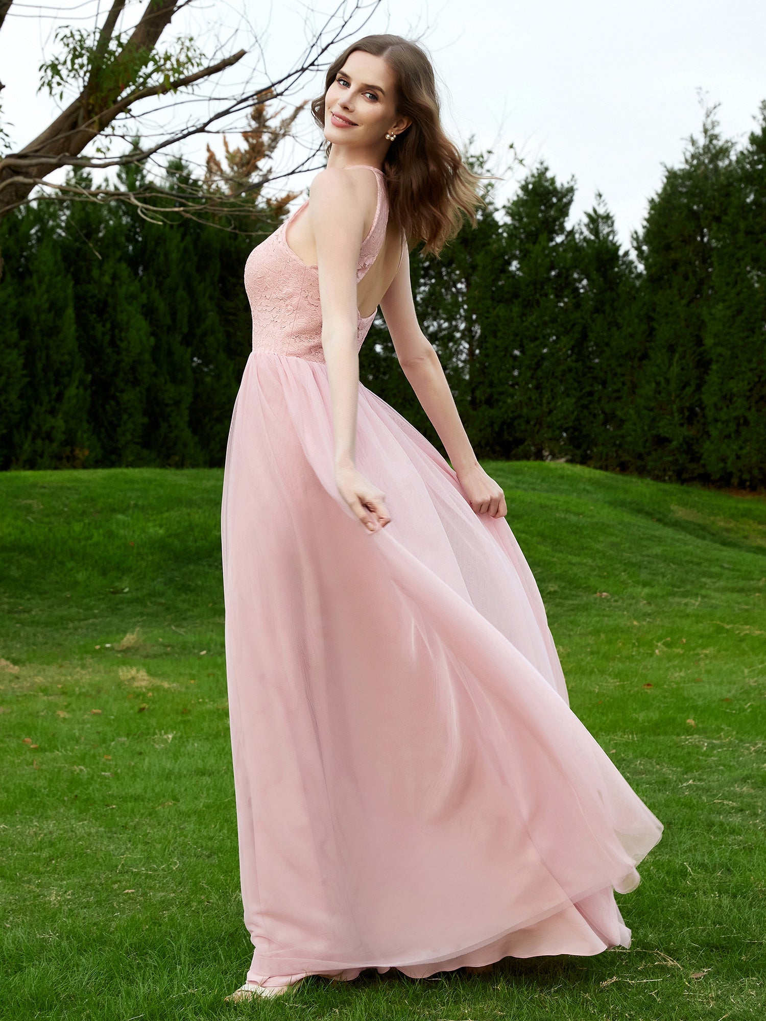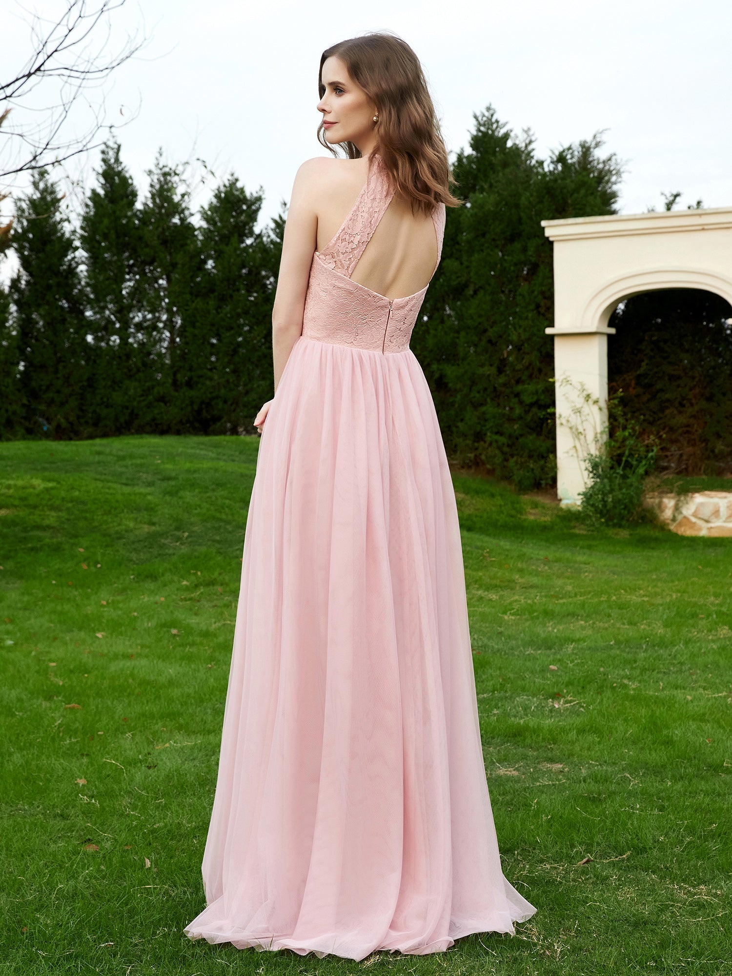 Lace Tulle Bridesmaid Gown Halter Neckline Dusty Rose