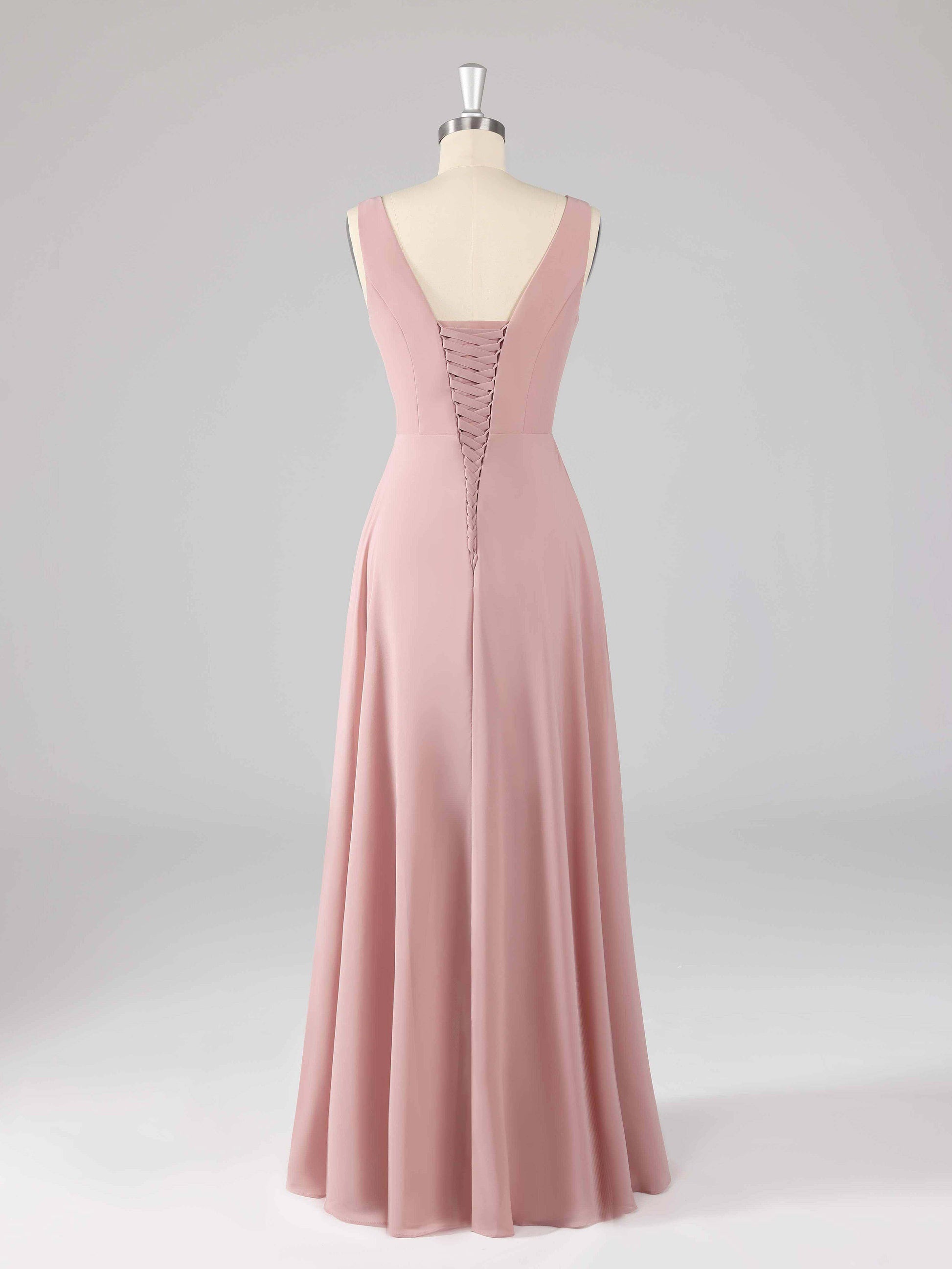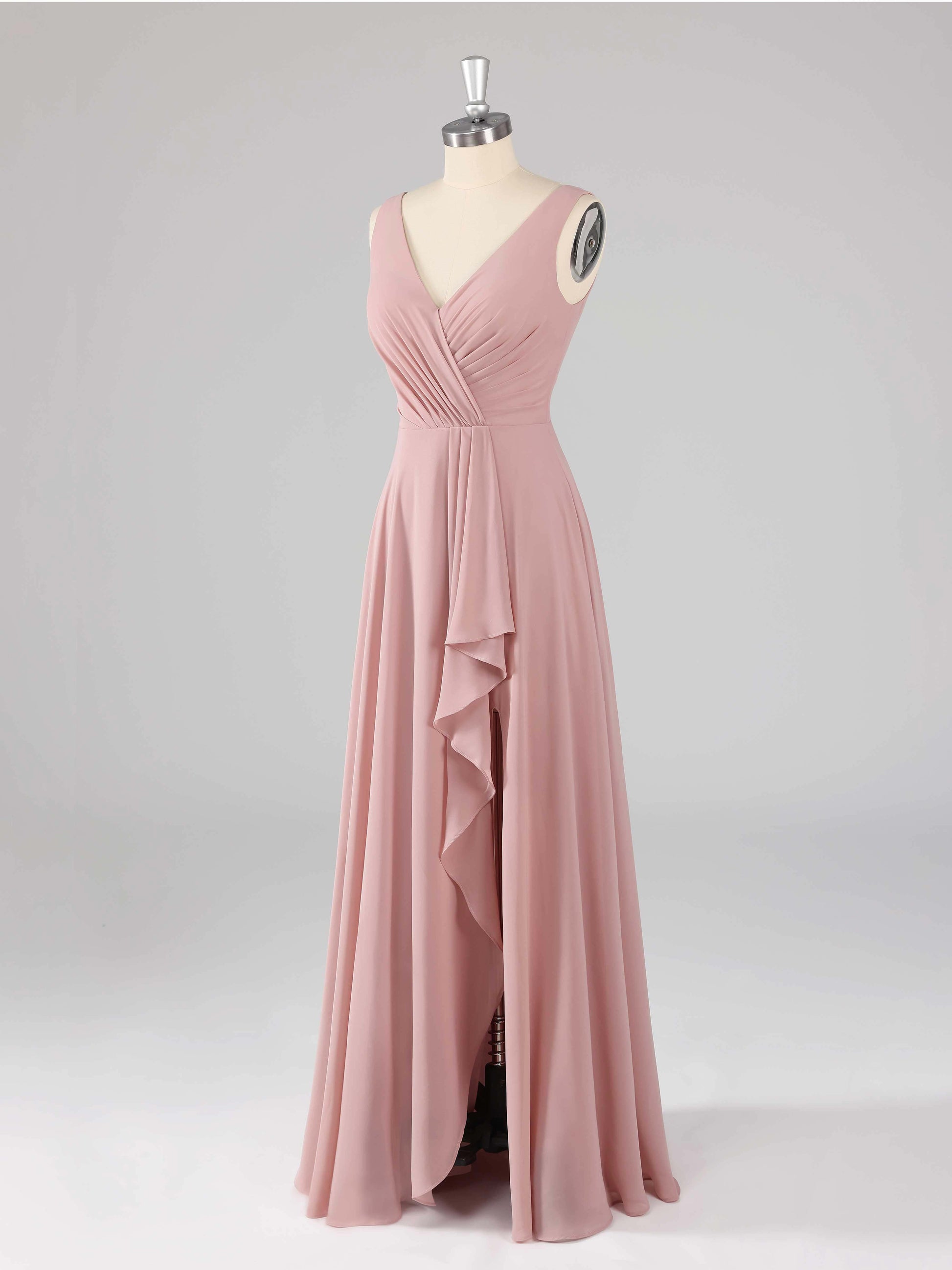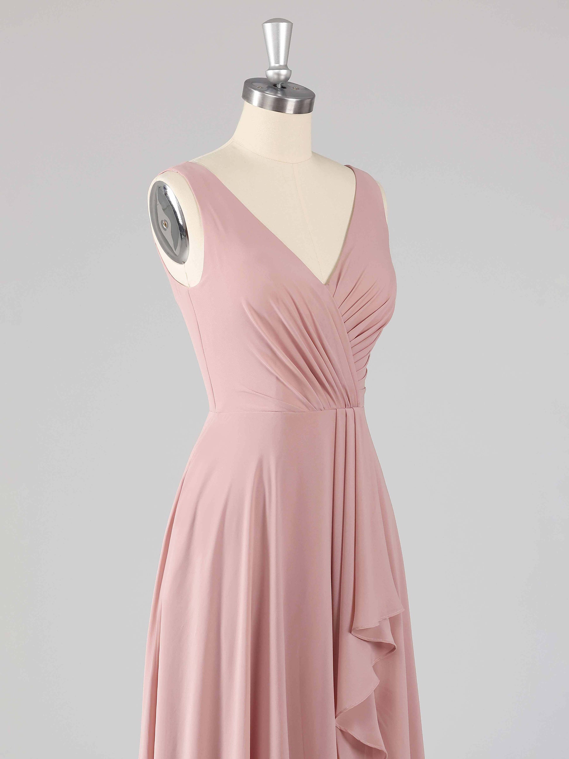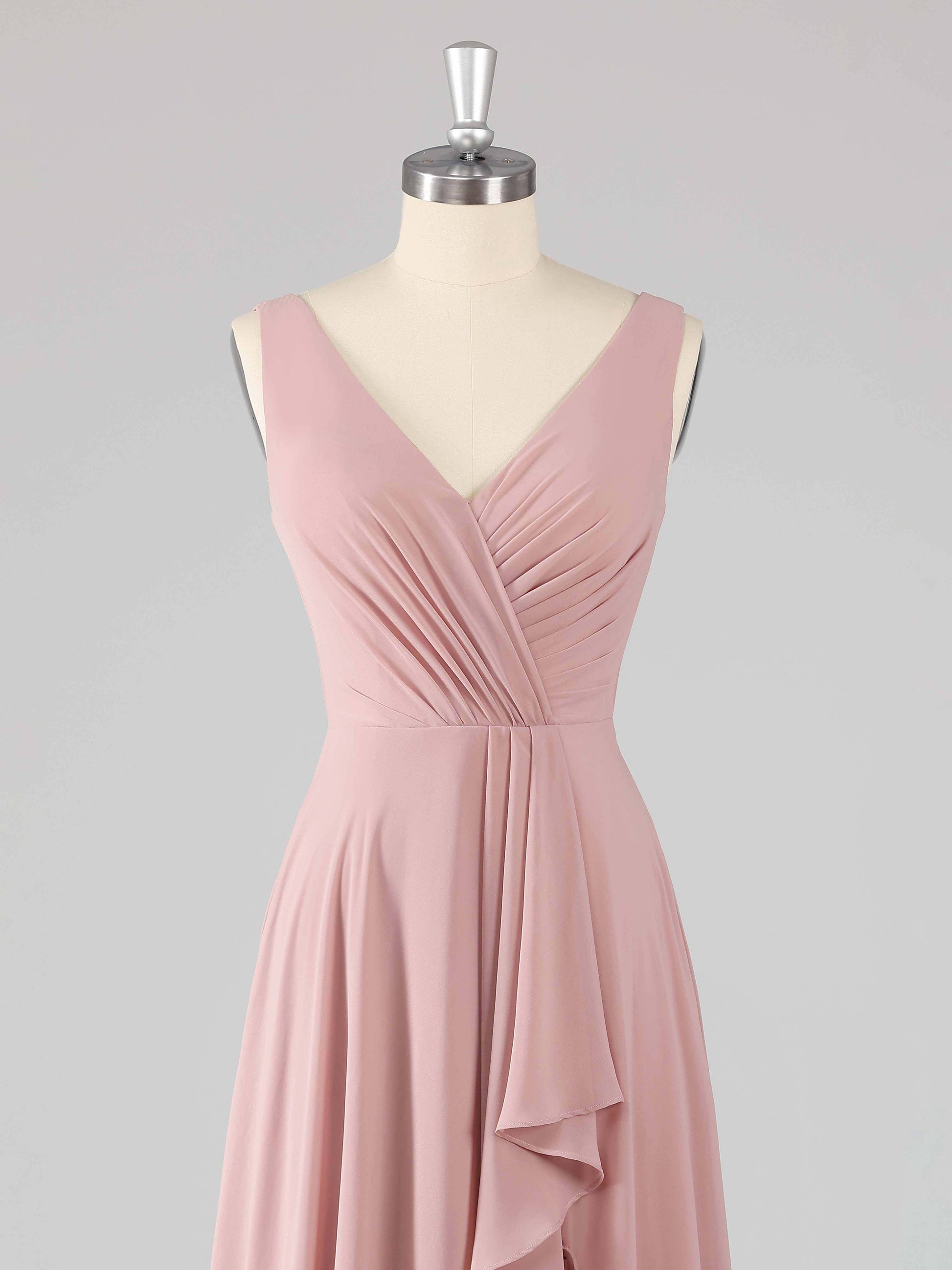 • Modern A-line bridesmaid dress with a sleeveless design and asymmetrical hem, offering a stylish, contemporary look. Perfect for bridesmaids seeking a chic and unique style for the big day.