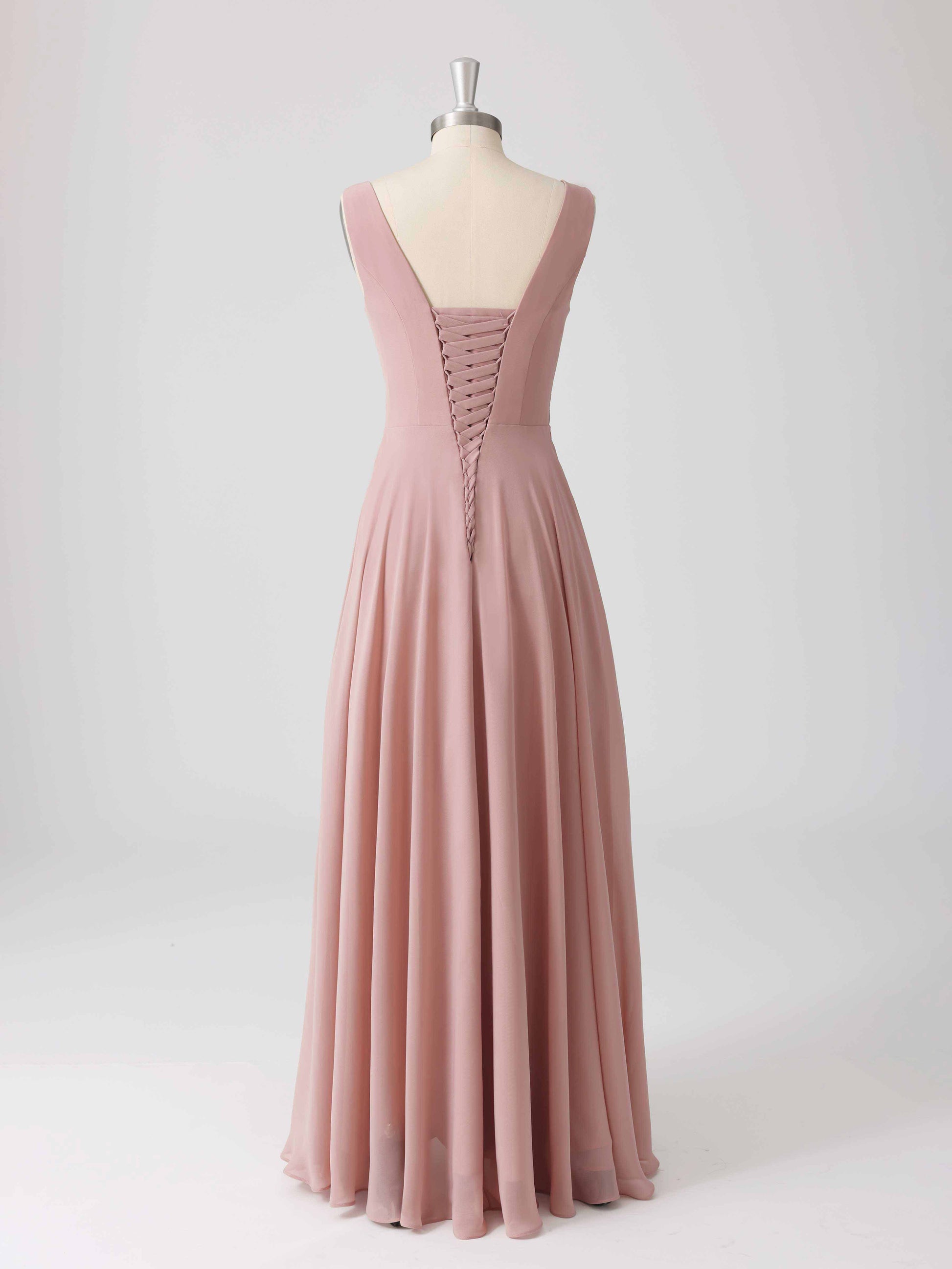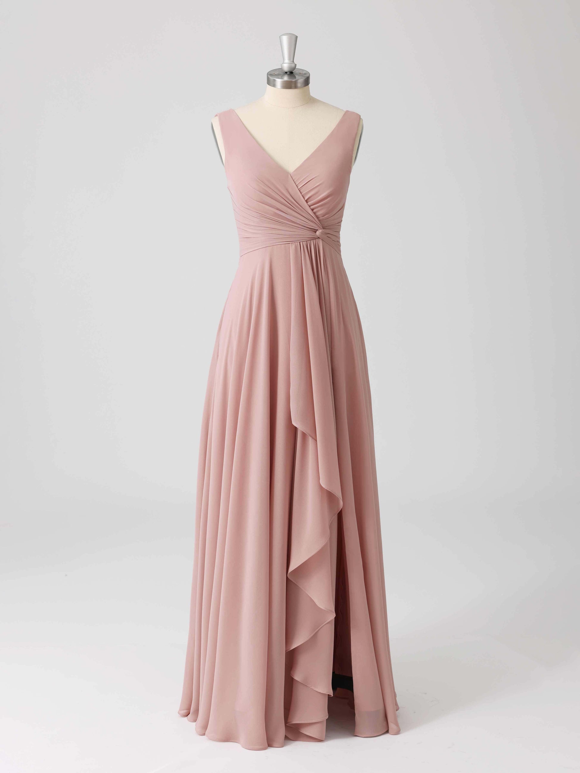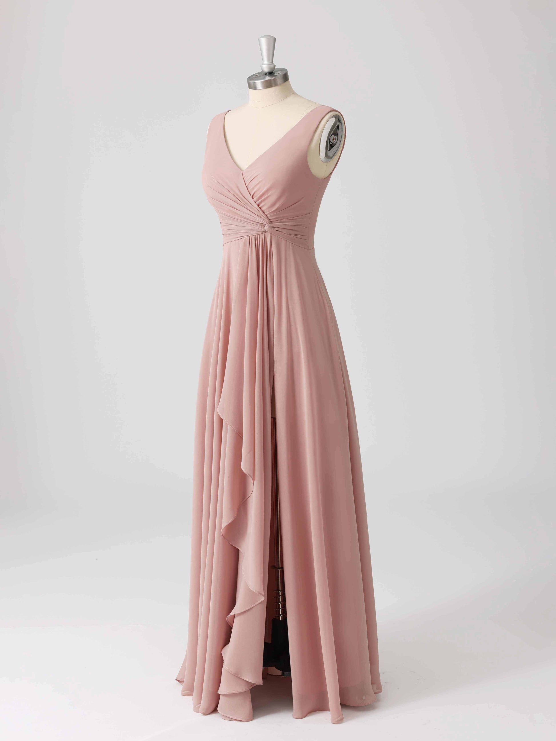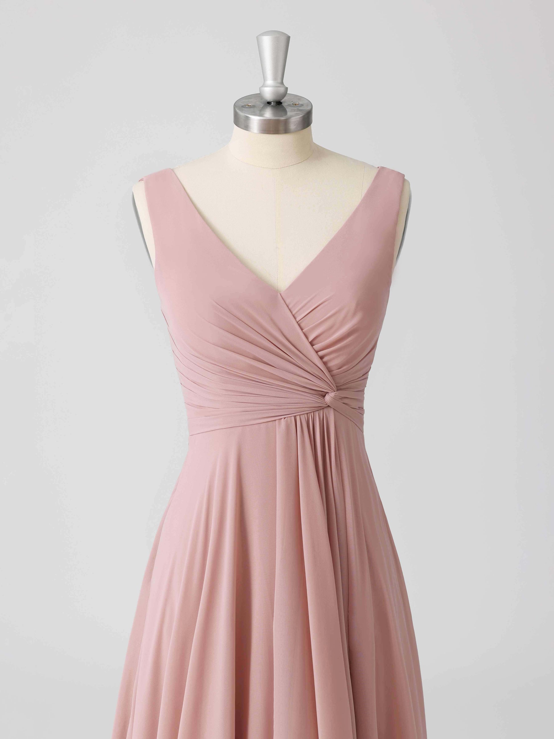• Chic A-line bridesmaid dress with a V-neck, sleeveless design, and asymmetrical hem, offering a modern, elegant silhouette. Perfect for a stylish, unique bridal look.