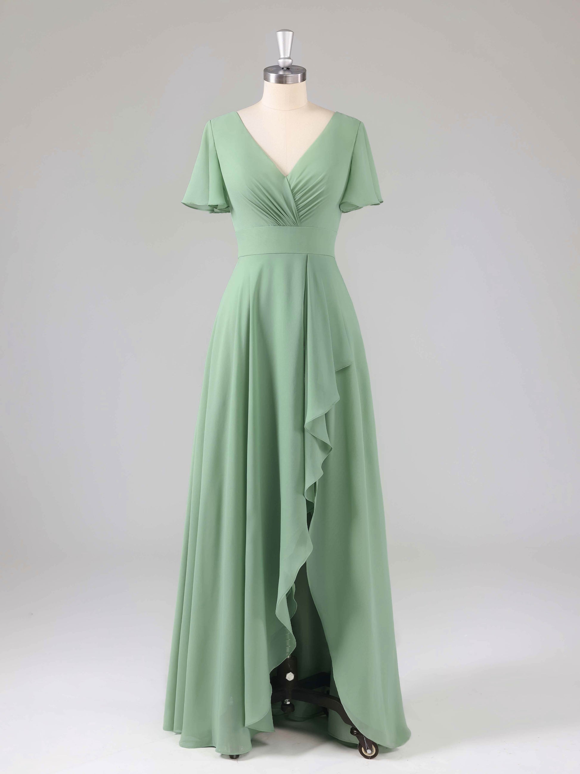 • V-Neck Ruffles Bridesmaid Dresses feature flutter sleeves, a thigh slit, and cascading ruffles. Lightweight chiffon and an A-line silhouette ensure elegance for weddings or garden soirées.