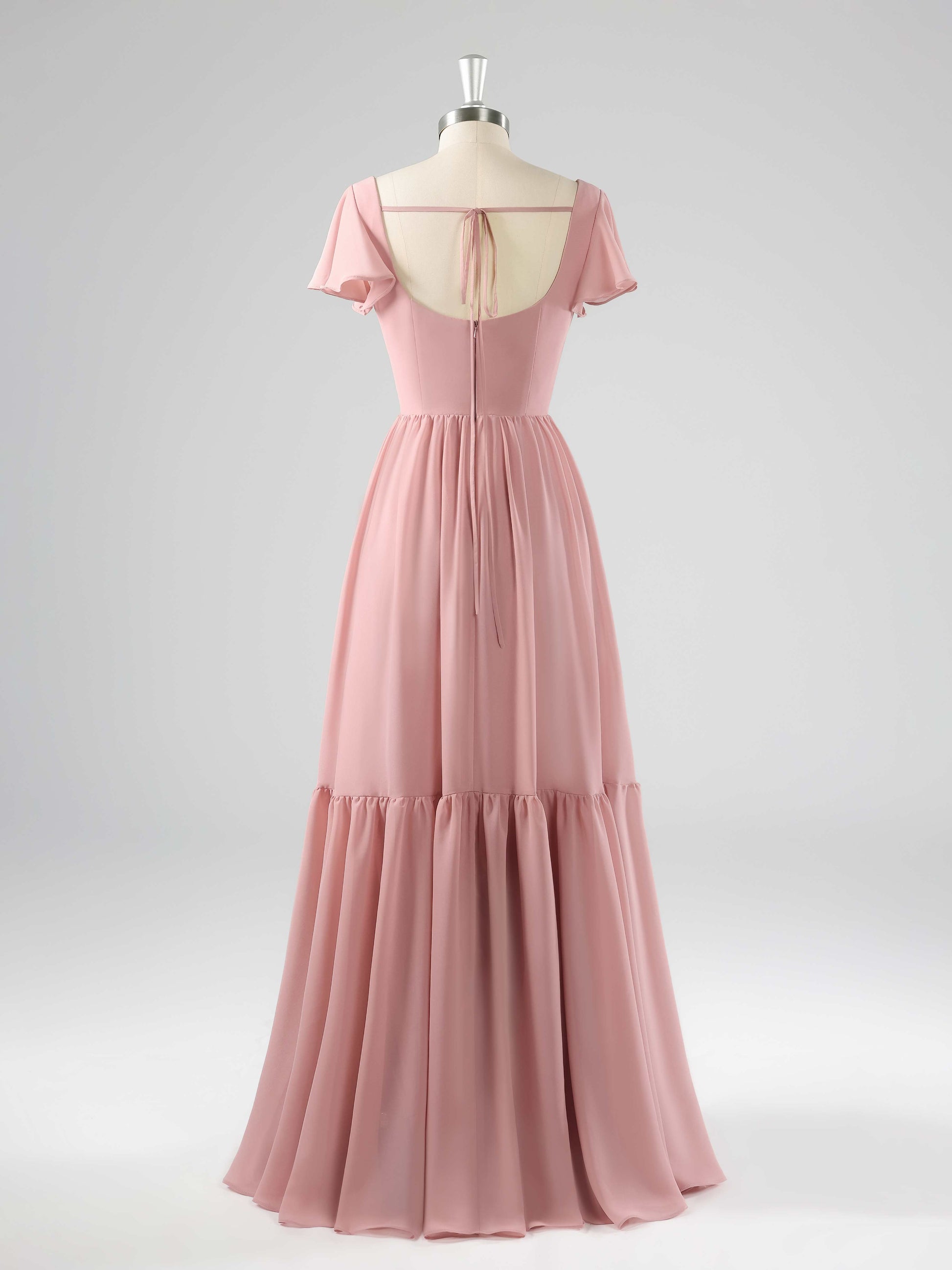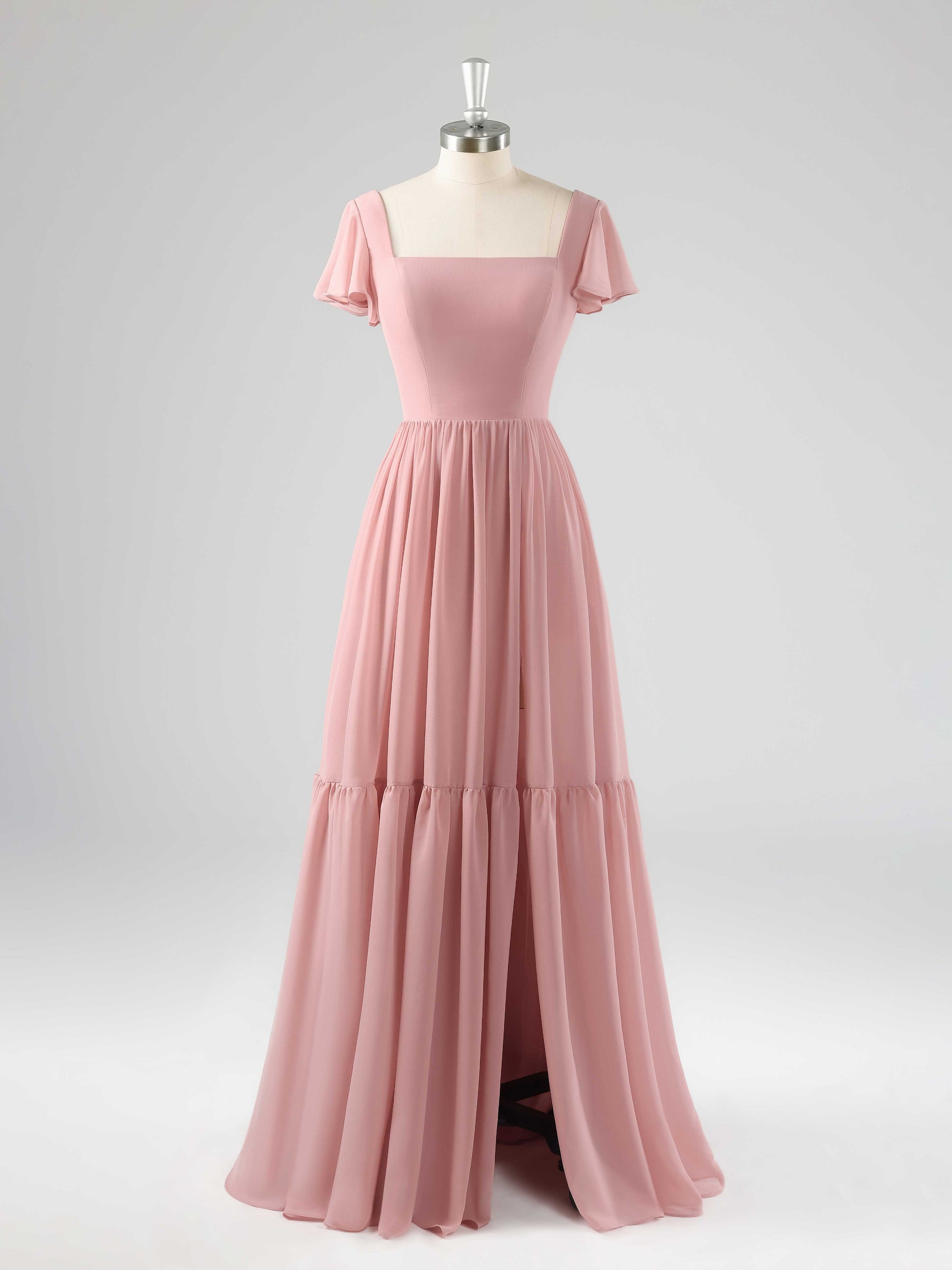 • The Lissette bridesmaid dress blends timeless charm with modern style, featuring soft flutter sleeves for a graceful touch and a thigh-high slit that adds just the right hint of allure.