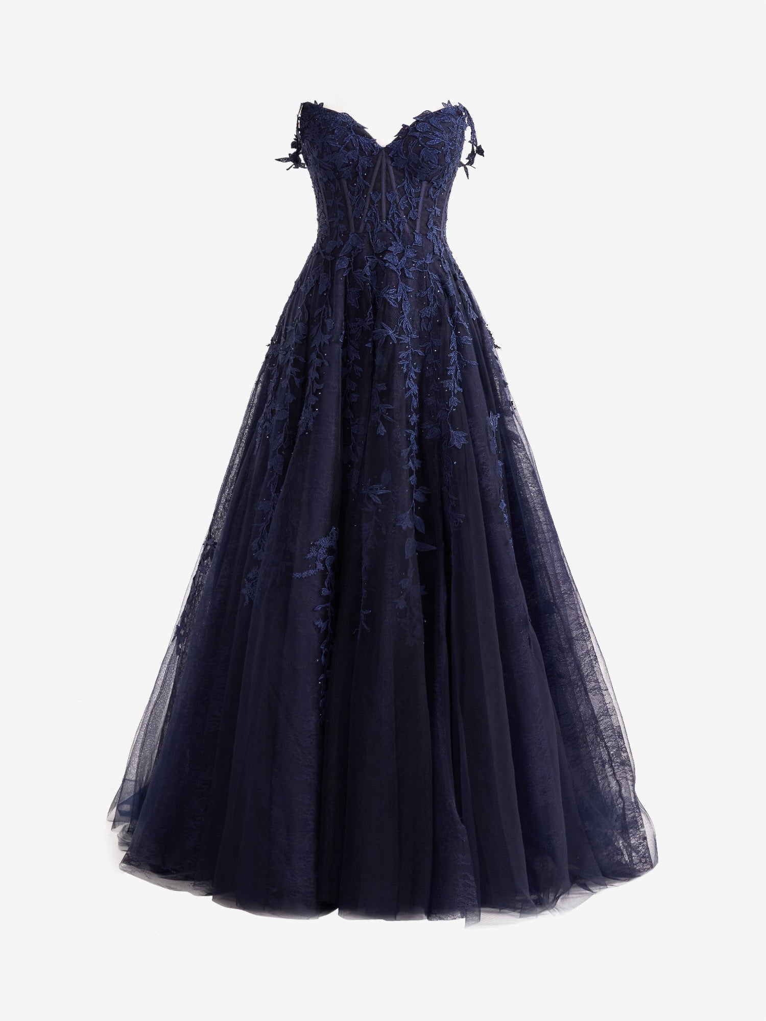 Mariana |Navy Blue A-line Sweetheart Lace Tulle Prom Dress with Slit