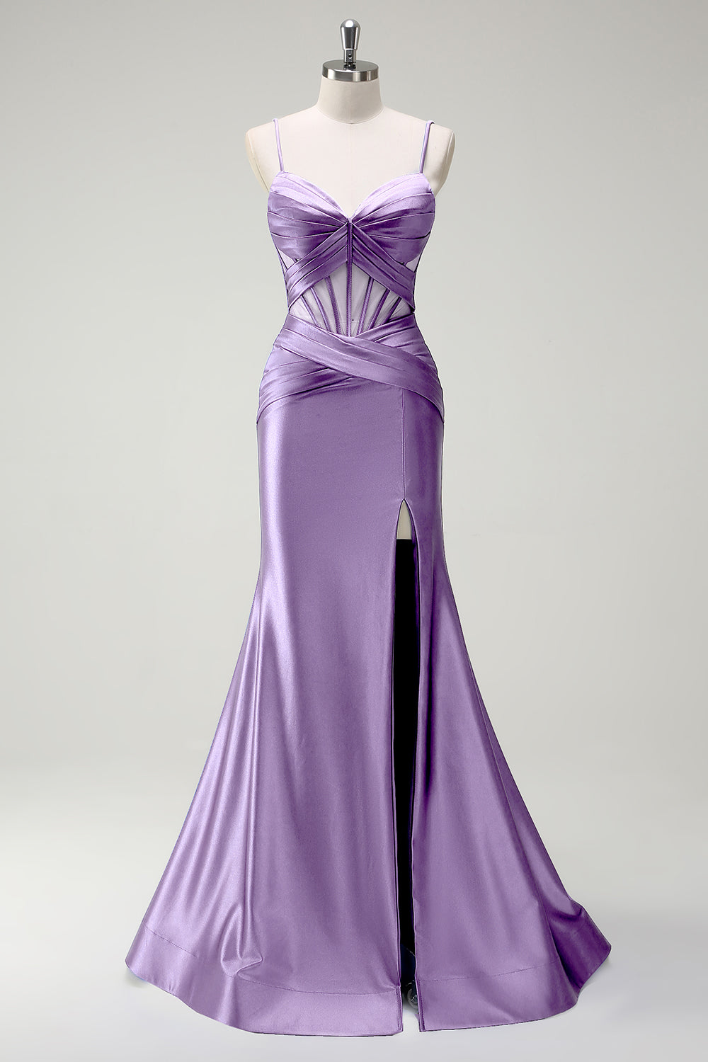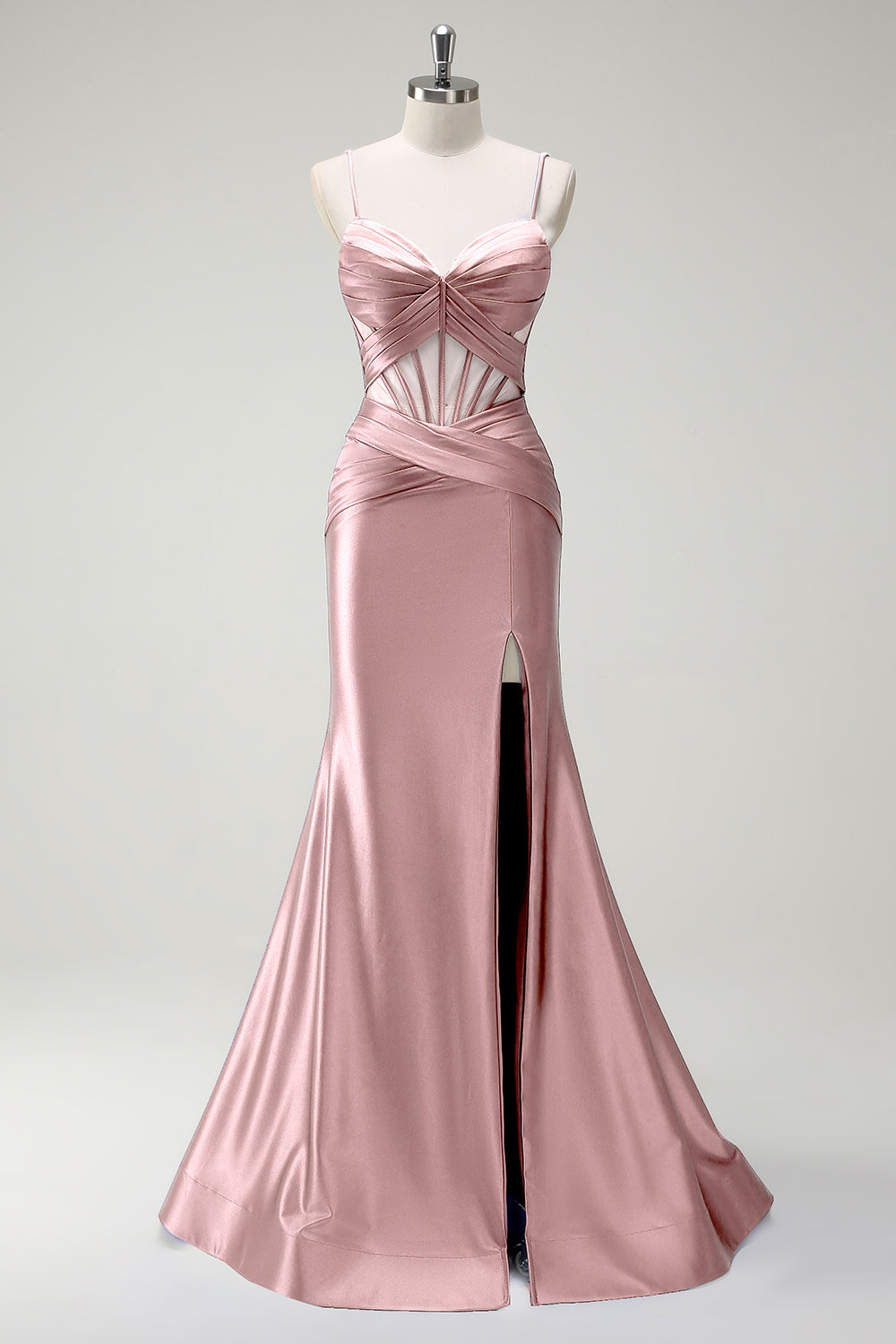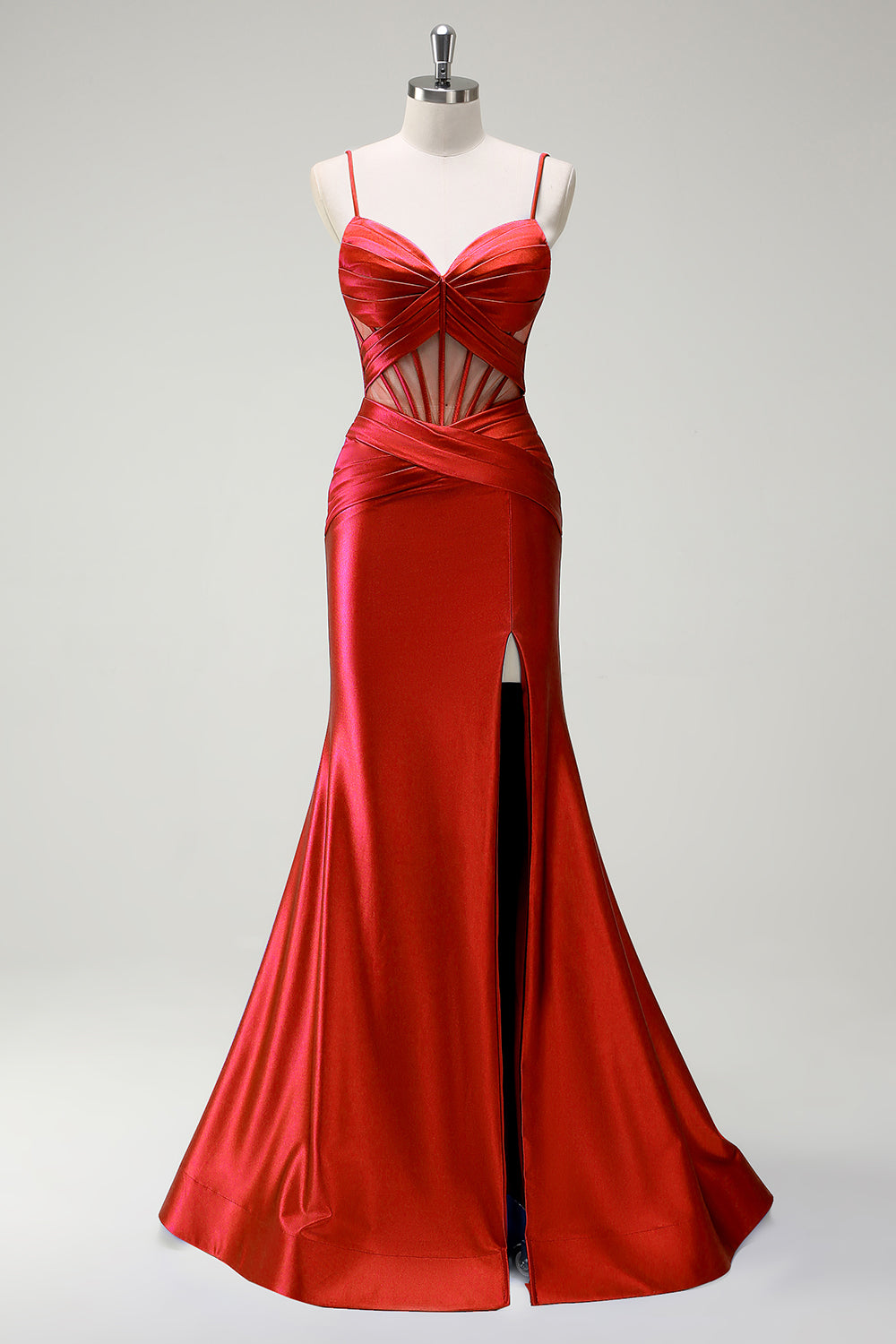 Mermaid Fuchsia Spaghetti Straps Beaded Long Prom Dress with Slit