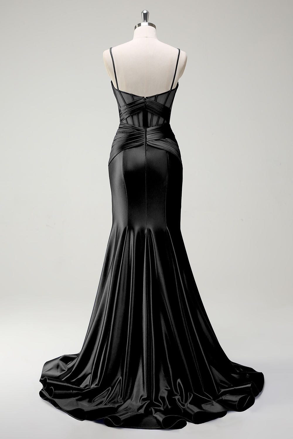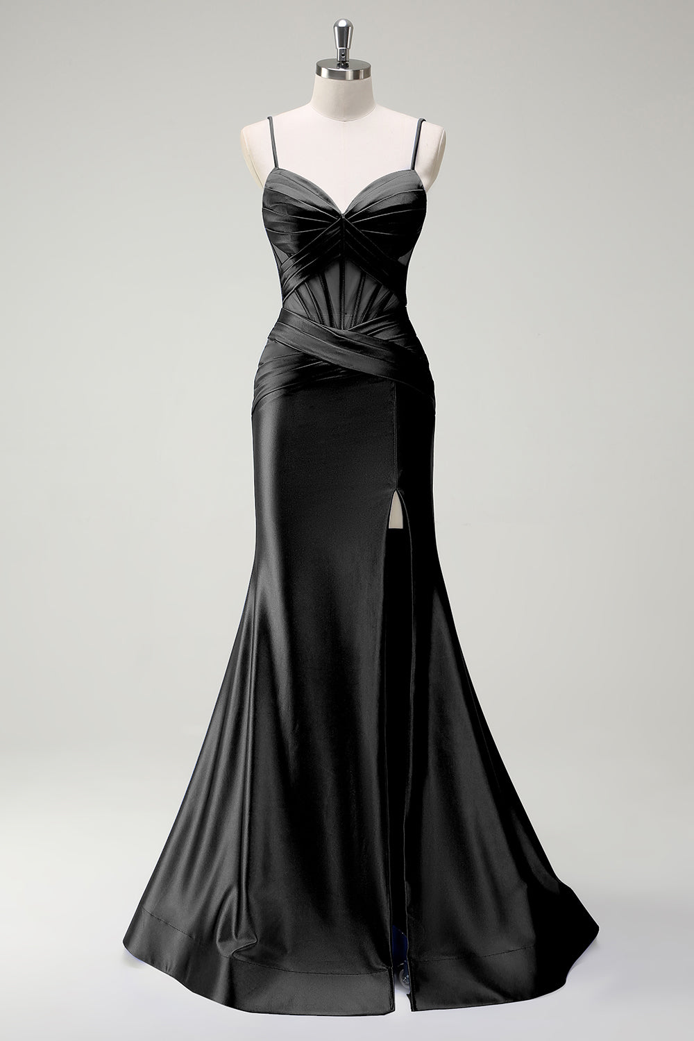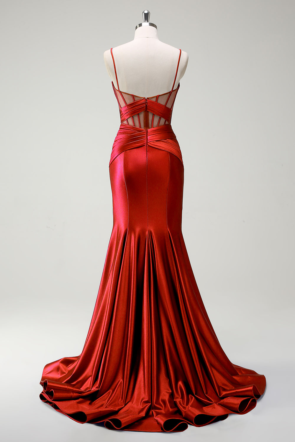 Mermaid Fuchsia Spaghetti Straps Beaded Long Prom Dress with Slit