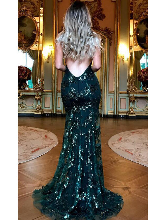 Mermaid Spaghetti Strap Floor-Length Tulle Sequined Prom Dresses