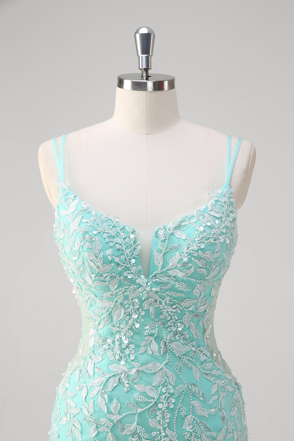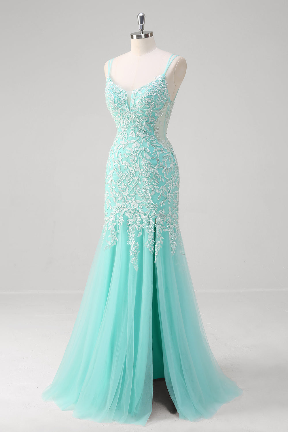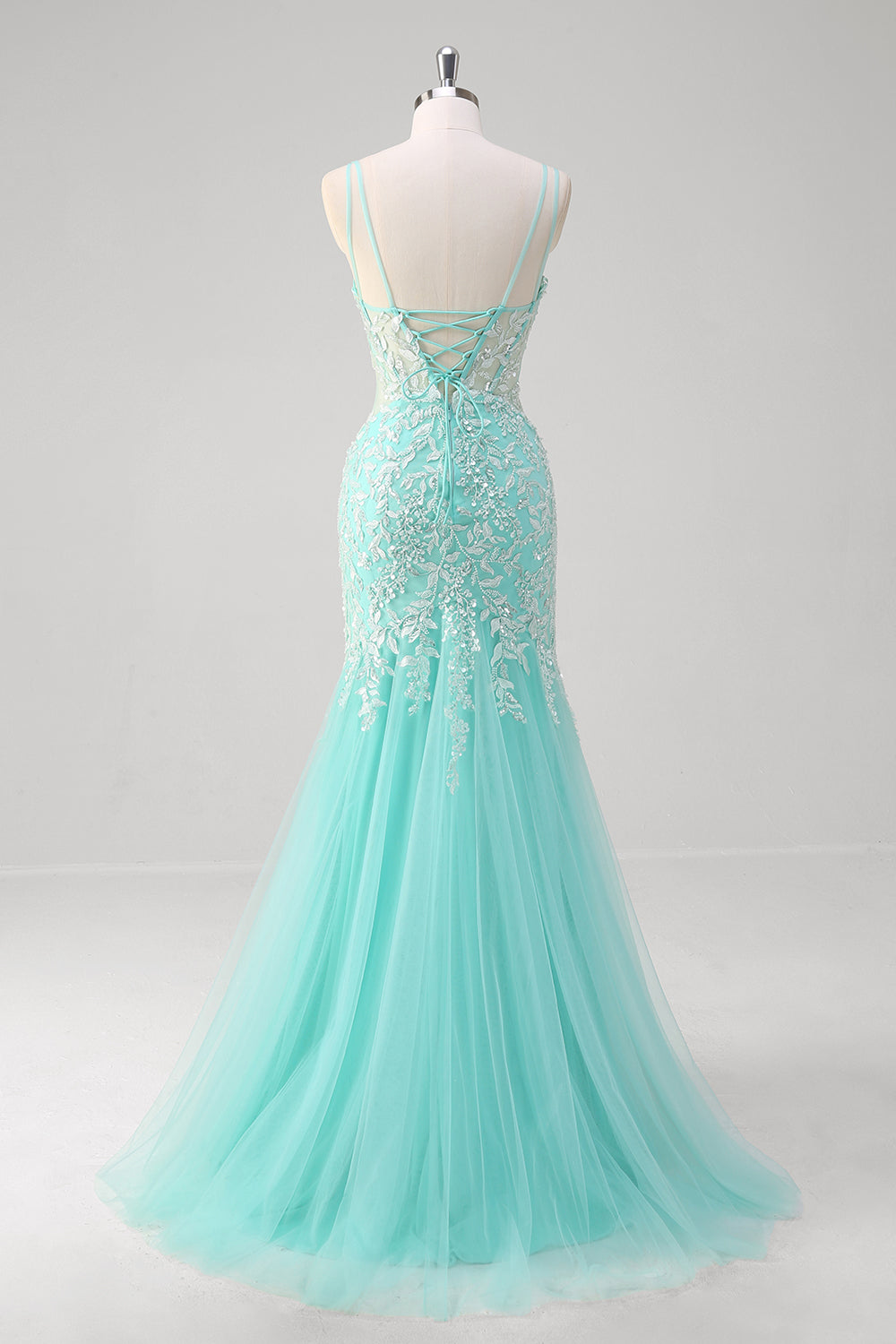 Mint Floral Mermaid Spaghetti Straps Corset Long Prom Dress with Slit