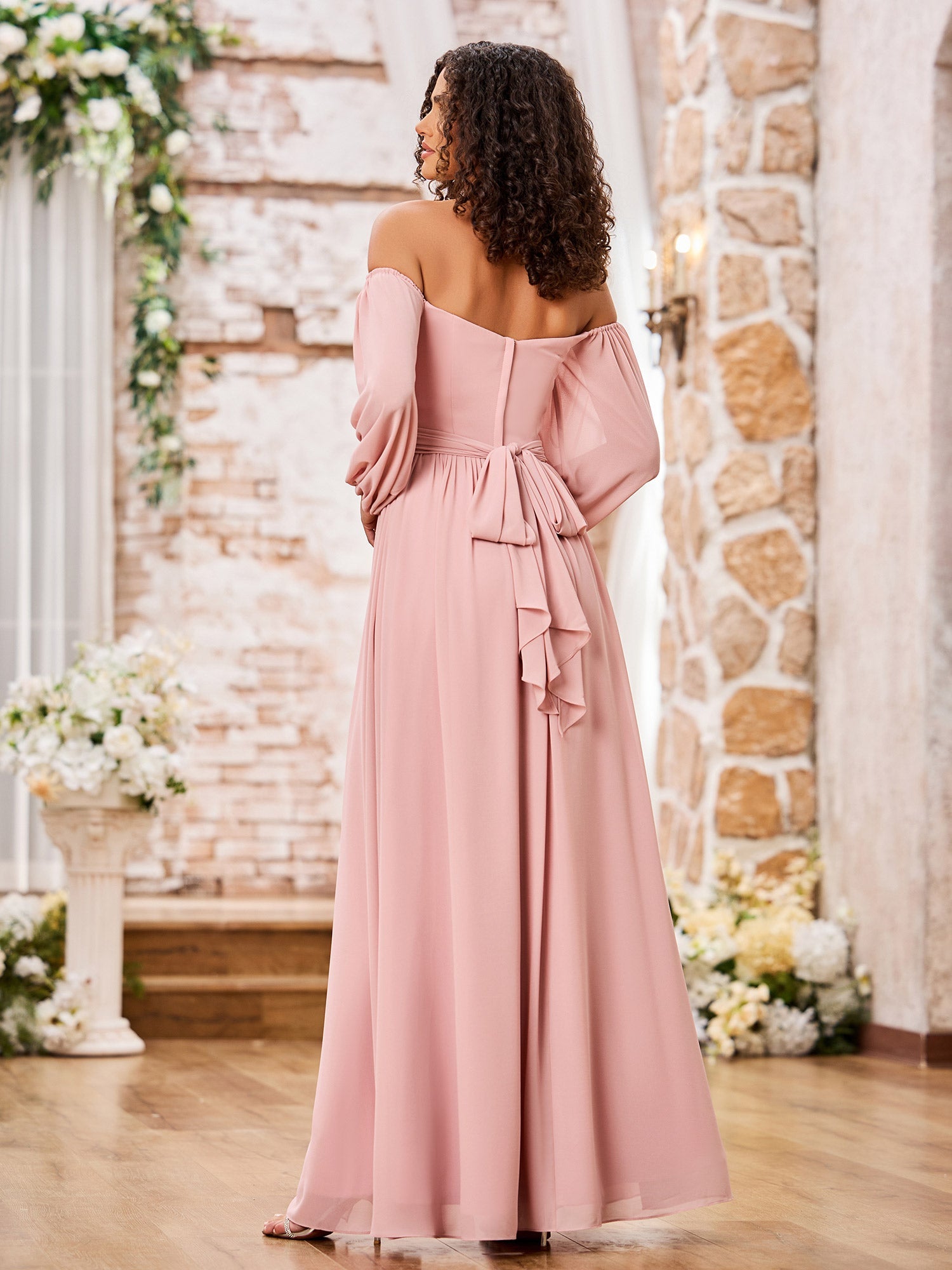 • This elegant off-shoulder chiffon dress features long sleeves and a flattering A-line silhouette. The floor-length hemline adds sophistication, while the backless design with a zipper closure offers a touch of allure. Perfect for a formal occasion.