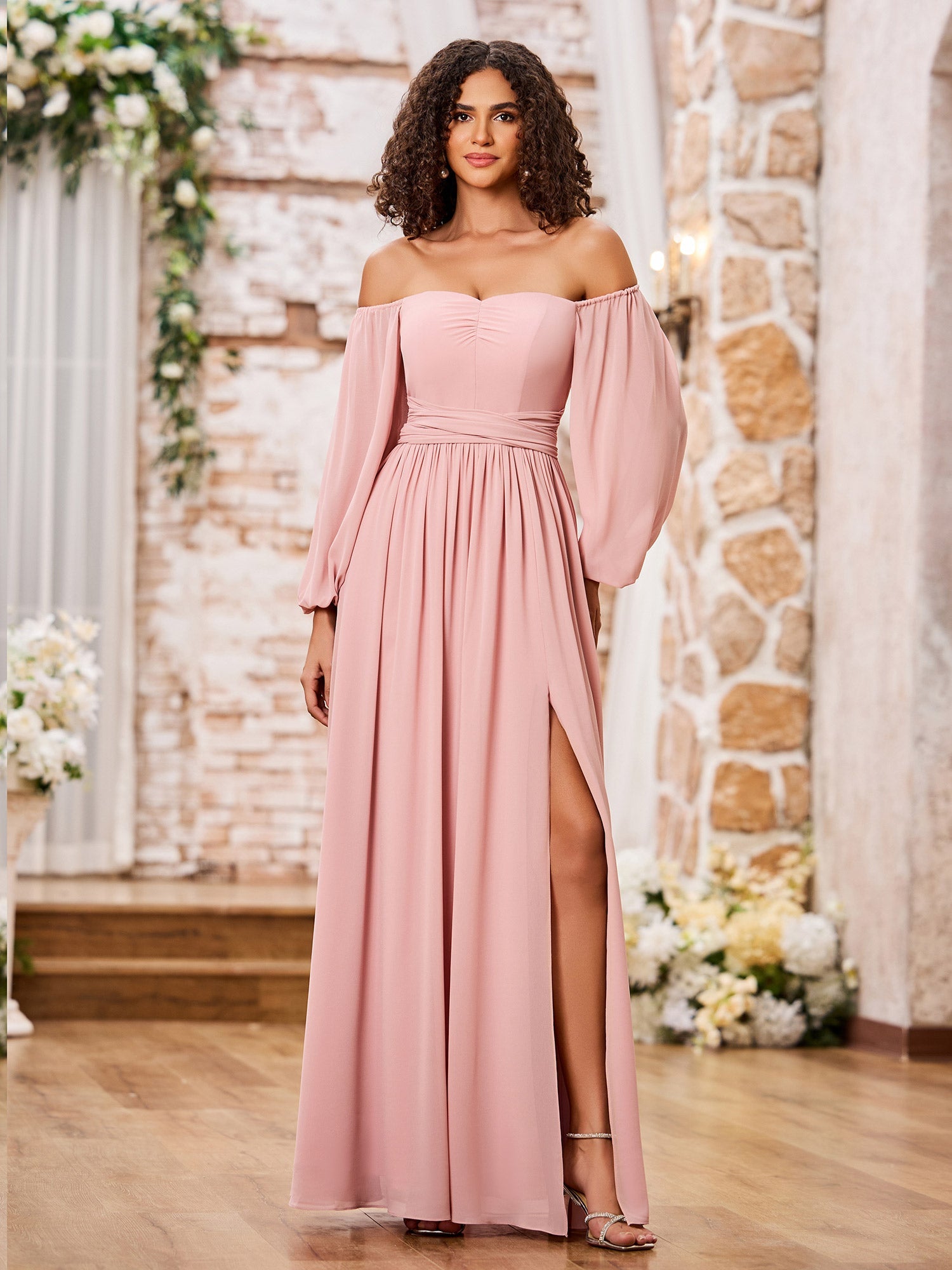 Off Shoulder Long Sleeves Chiffon Dresses with Slit Dusty Rose