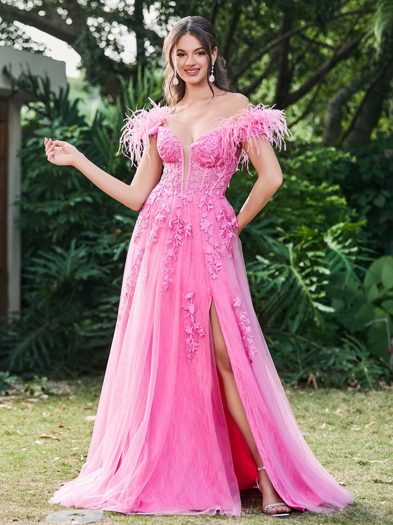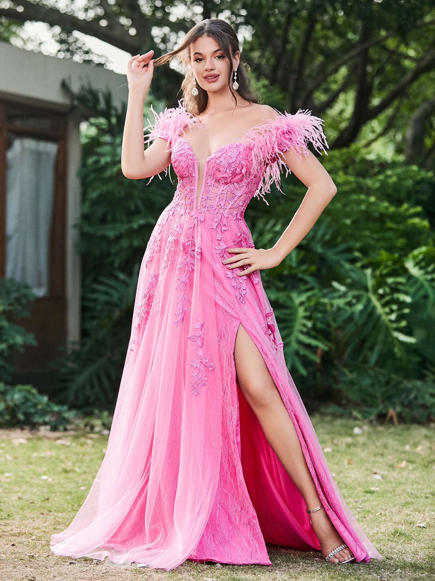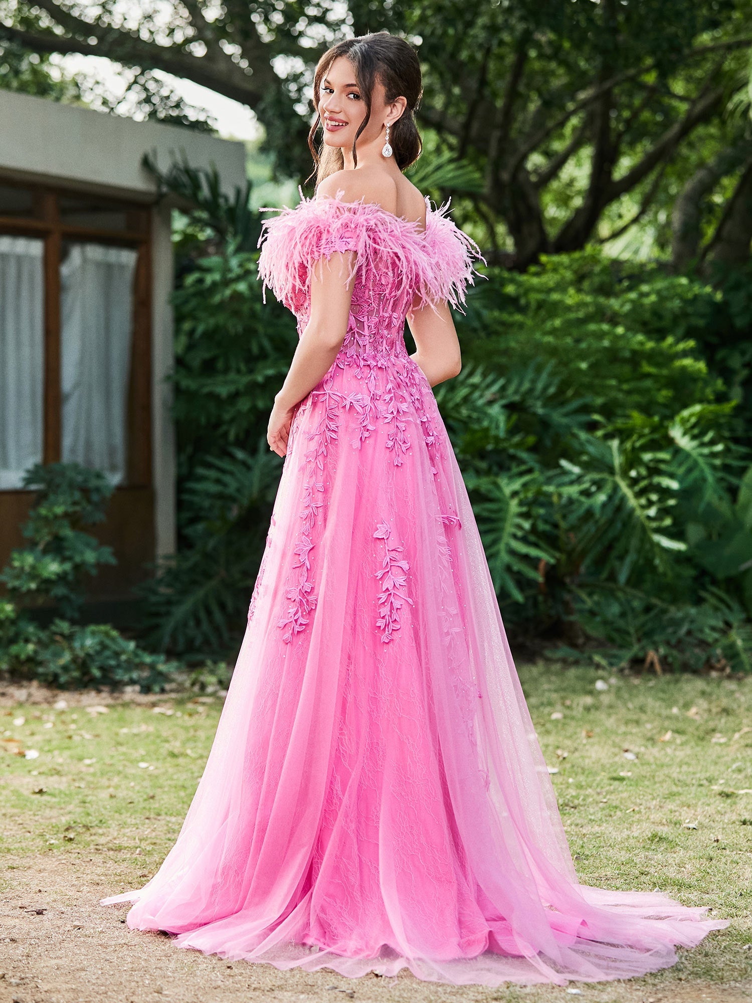 Off-the-Shoulder Lace Applique Side Slit A-Line Long Dress with Feathers Azalea