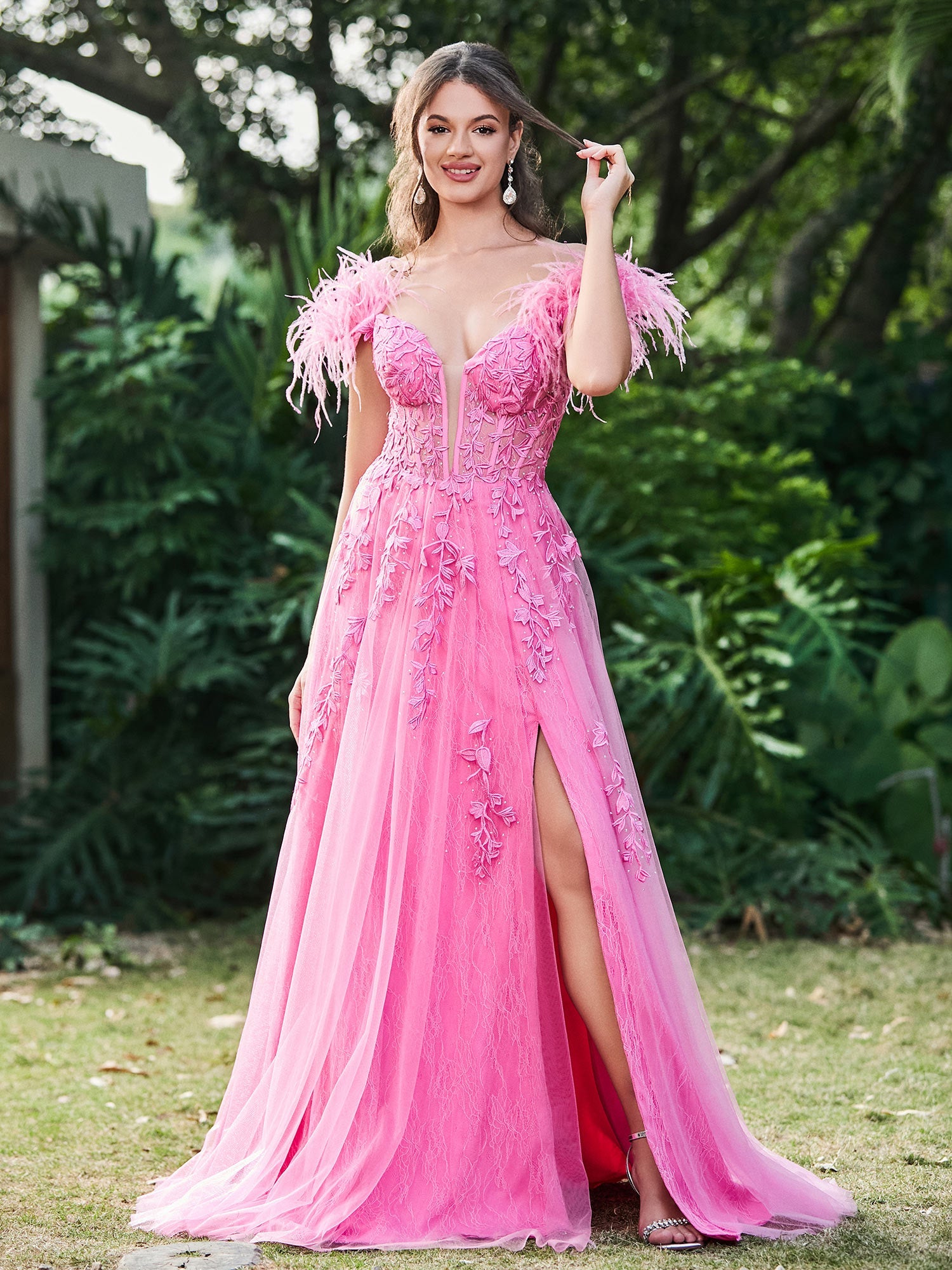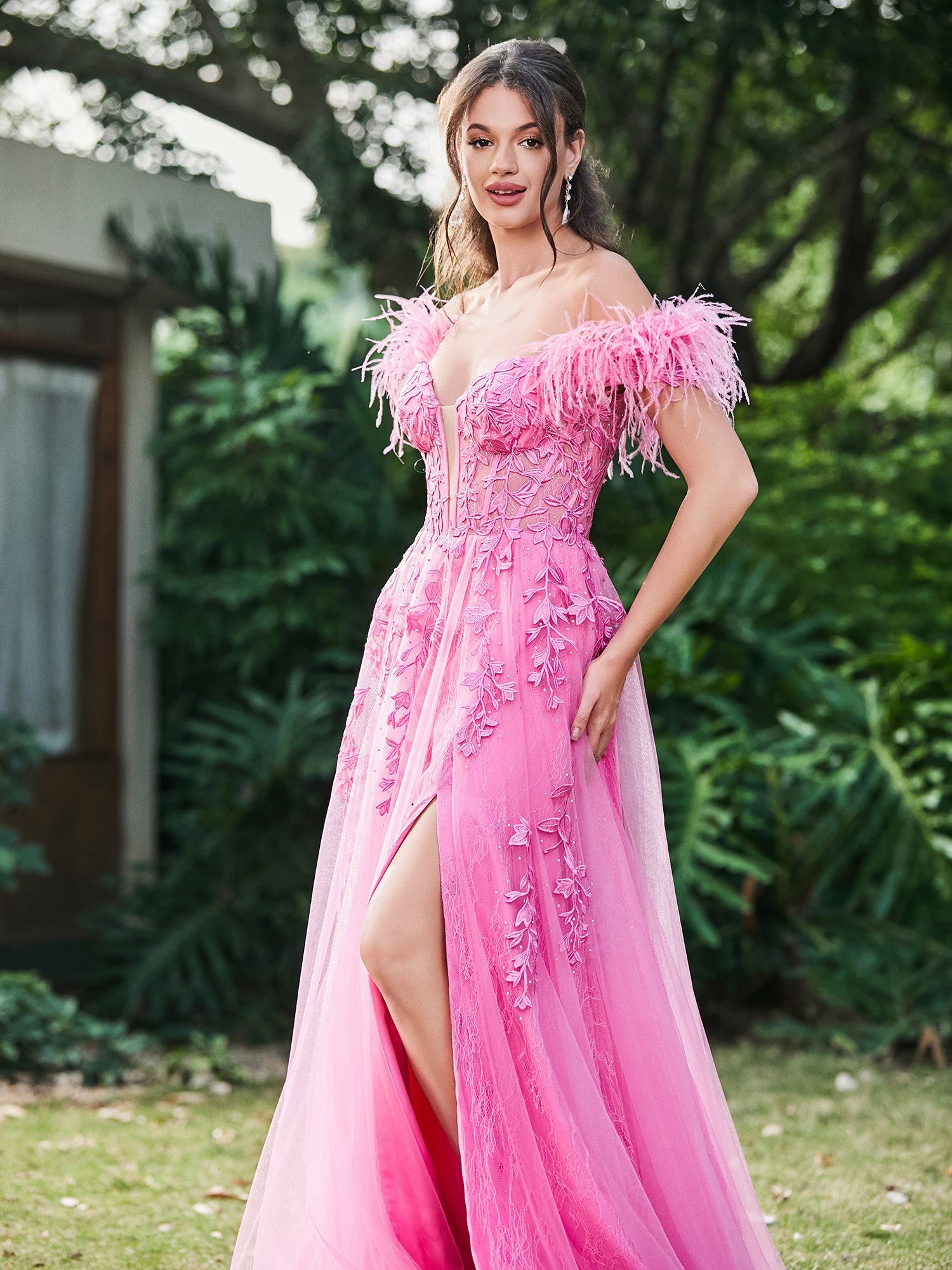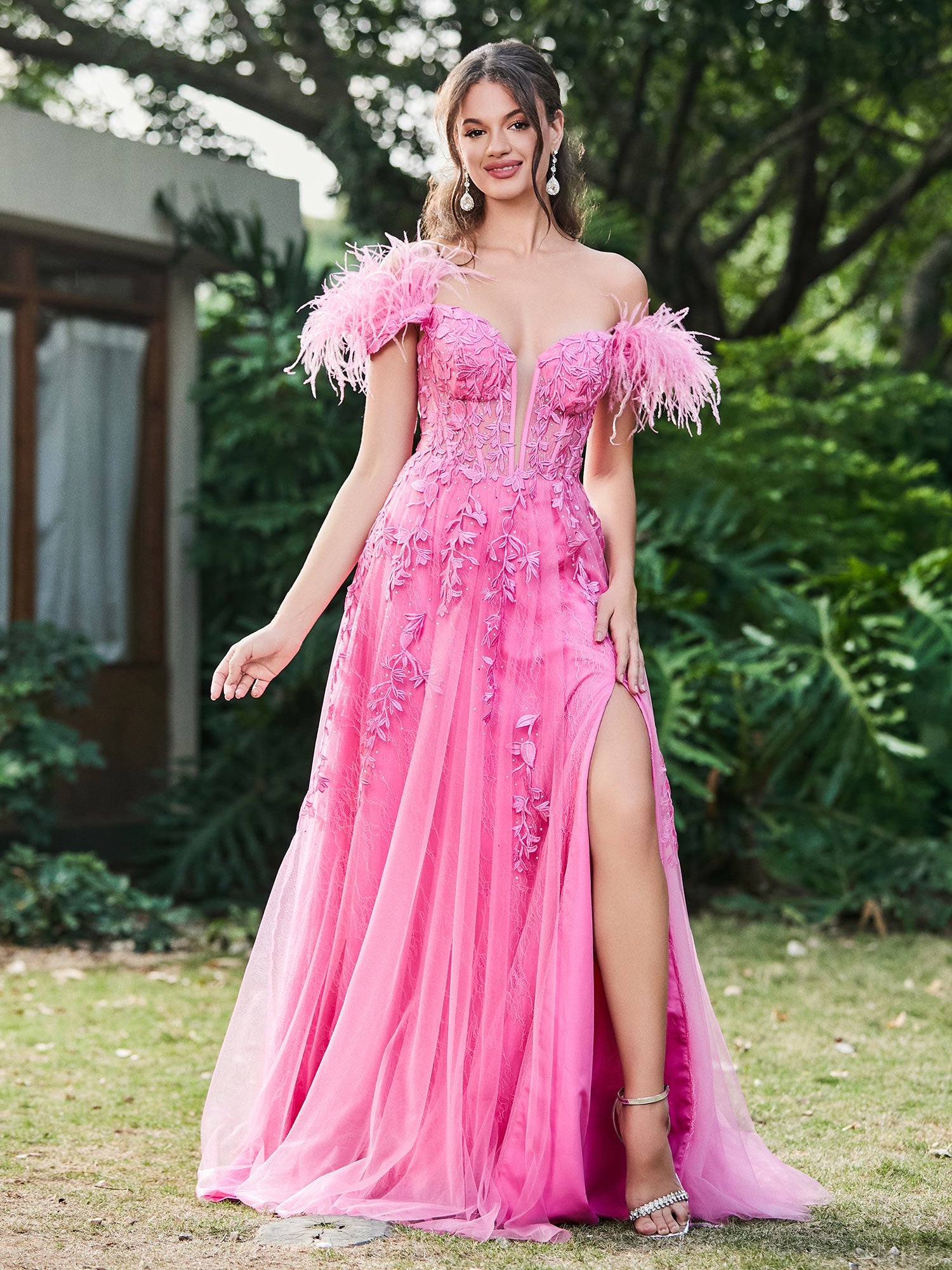Off-the-Shoulder Lace Applique Side Slit A-Line Long Dress with Feathers Azalea