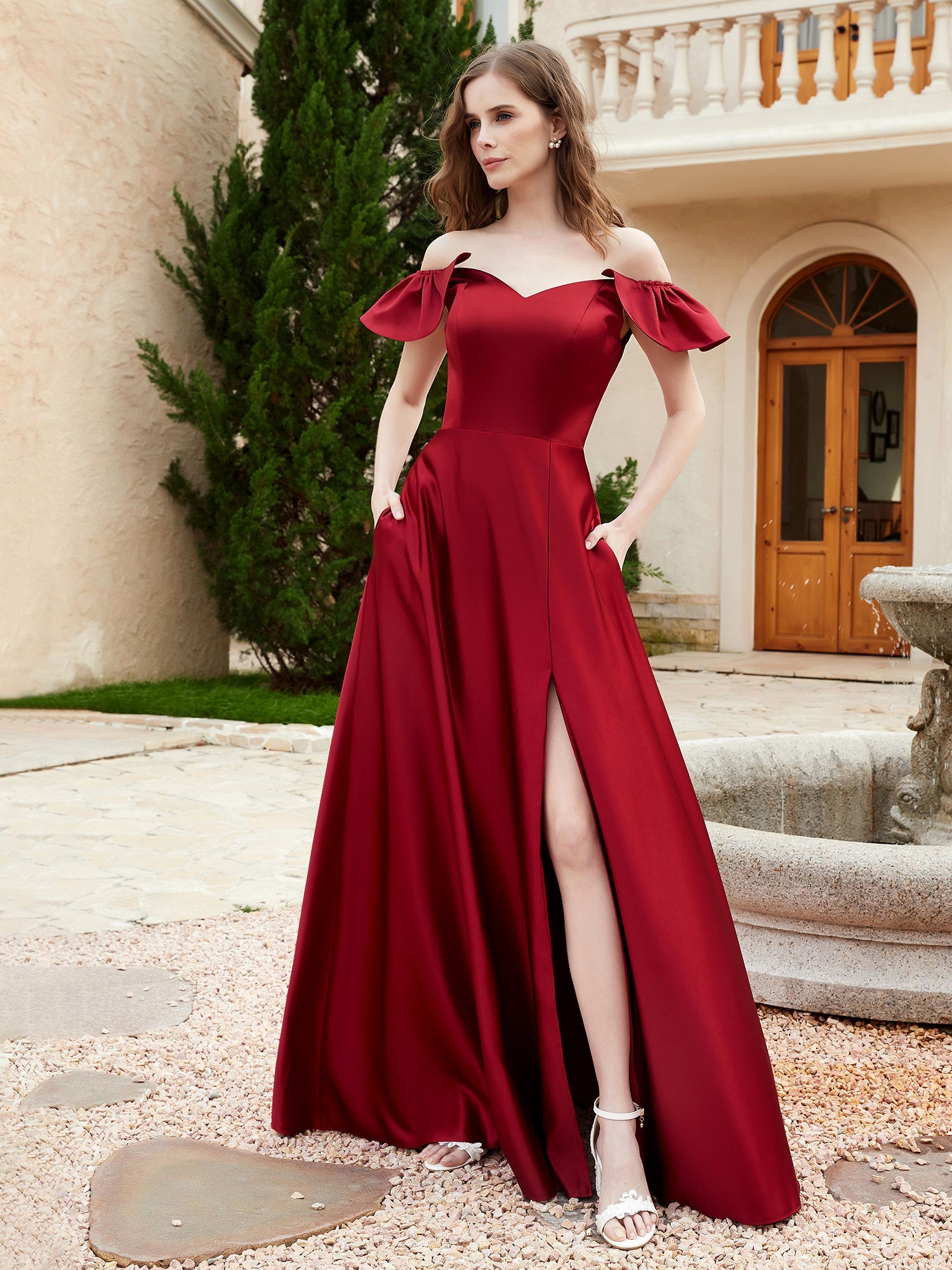 Off the Shoulder Satin Bridesmaid Gown With Pocket Burgundy