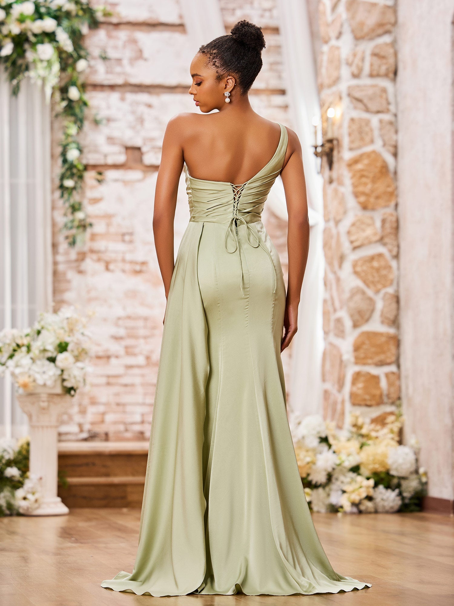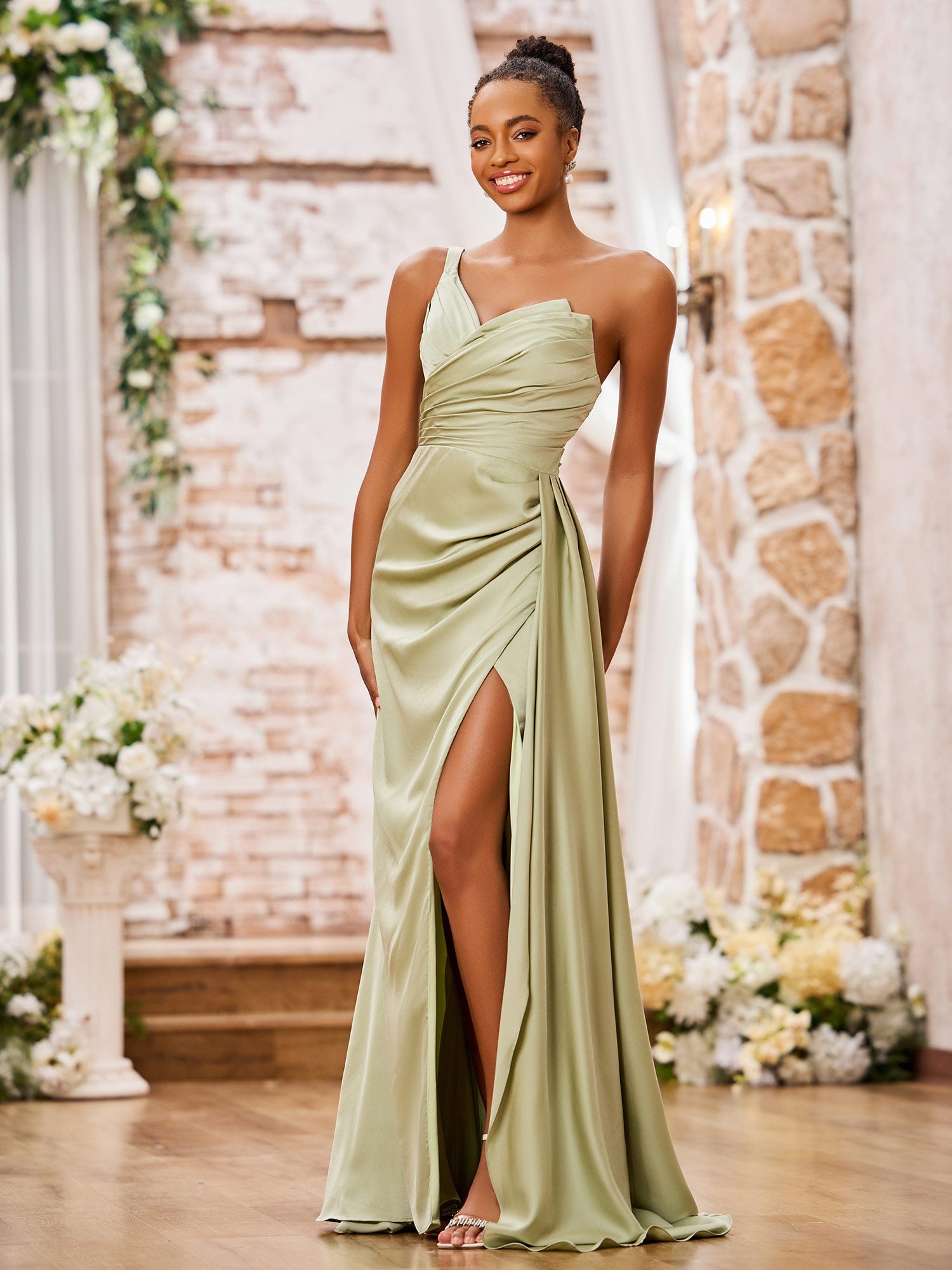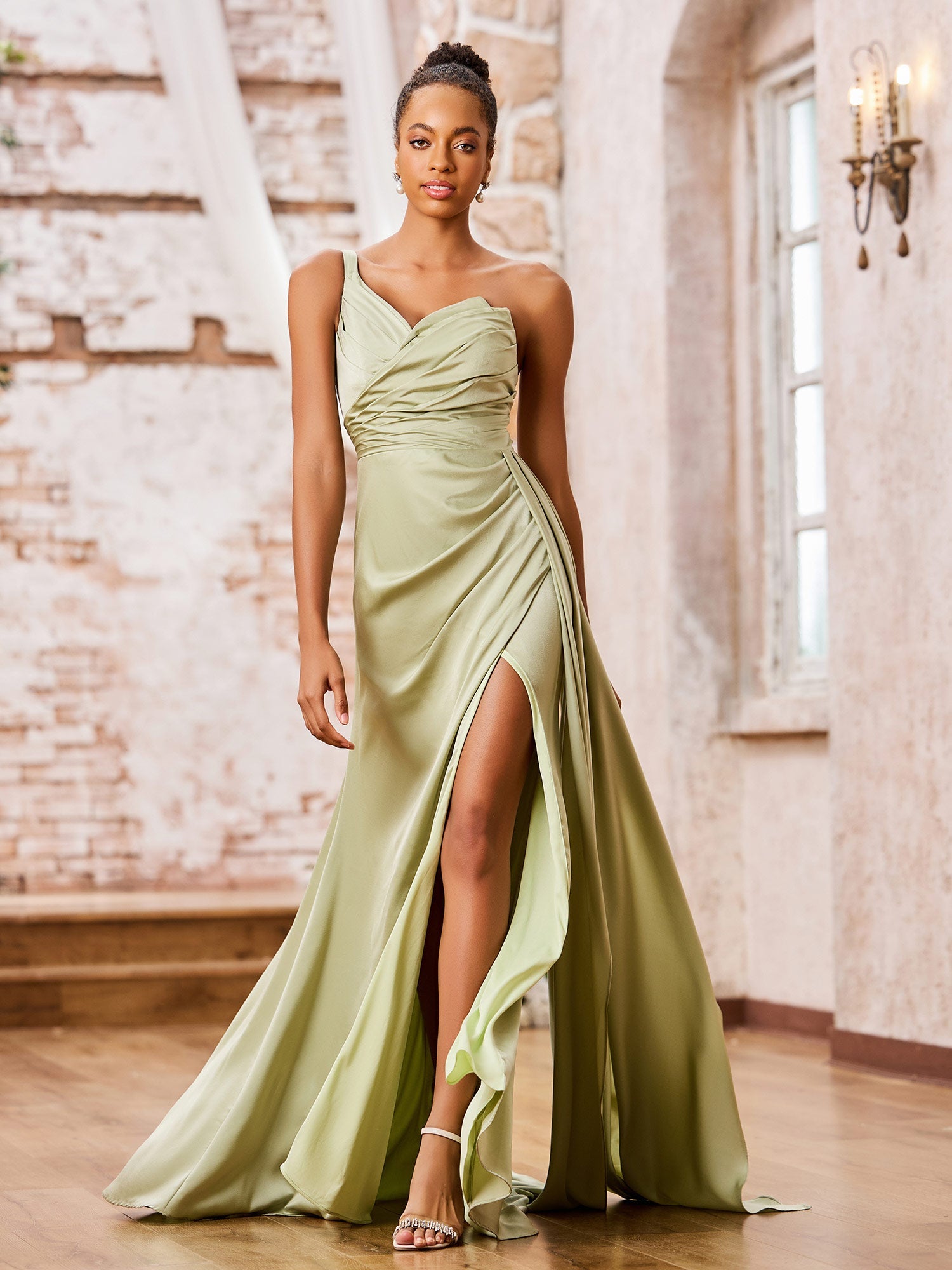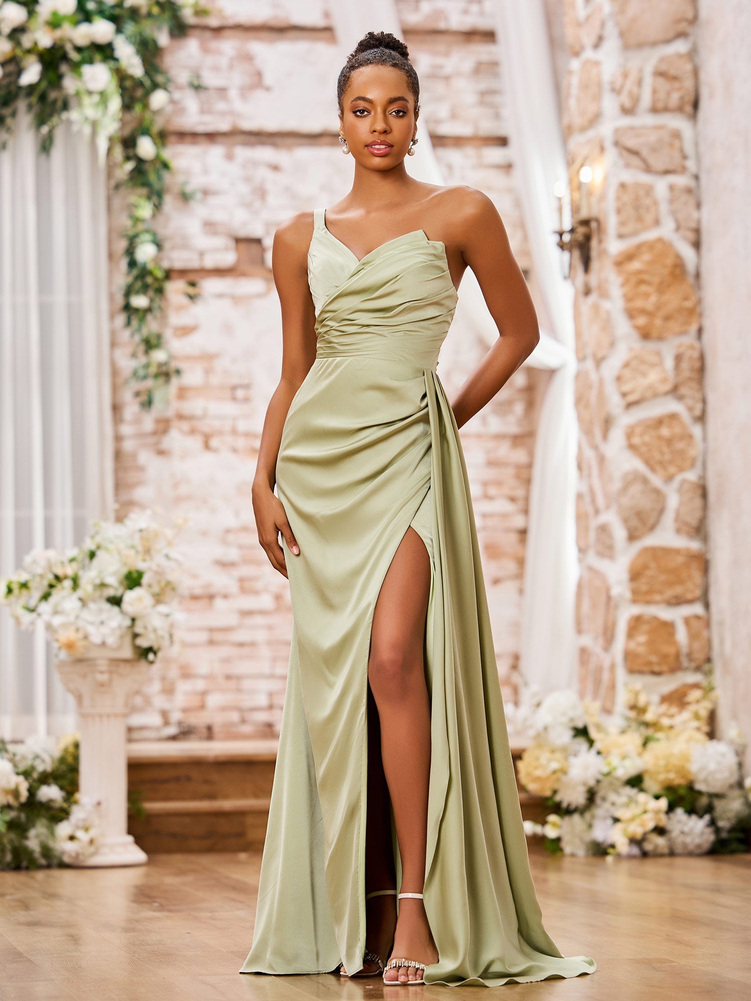 • This sleek one-shoulder satin dress features a seductive sweetheart neckline and a high slit, perfect for making a statement. The sheath silhouette contours the body beautifully, while the sweep train adds elegance.
