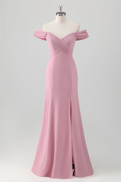 Pink Mermaid Off the Shoulder Long Bridesmaid Dress with Slit