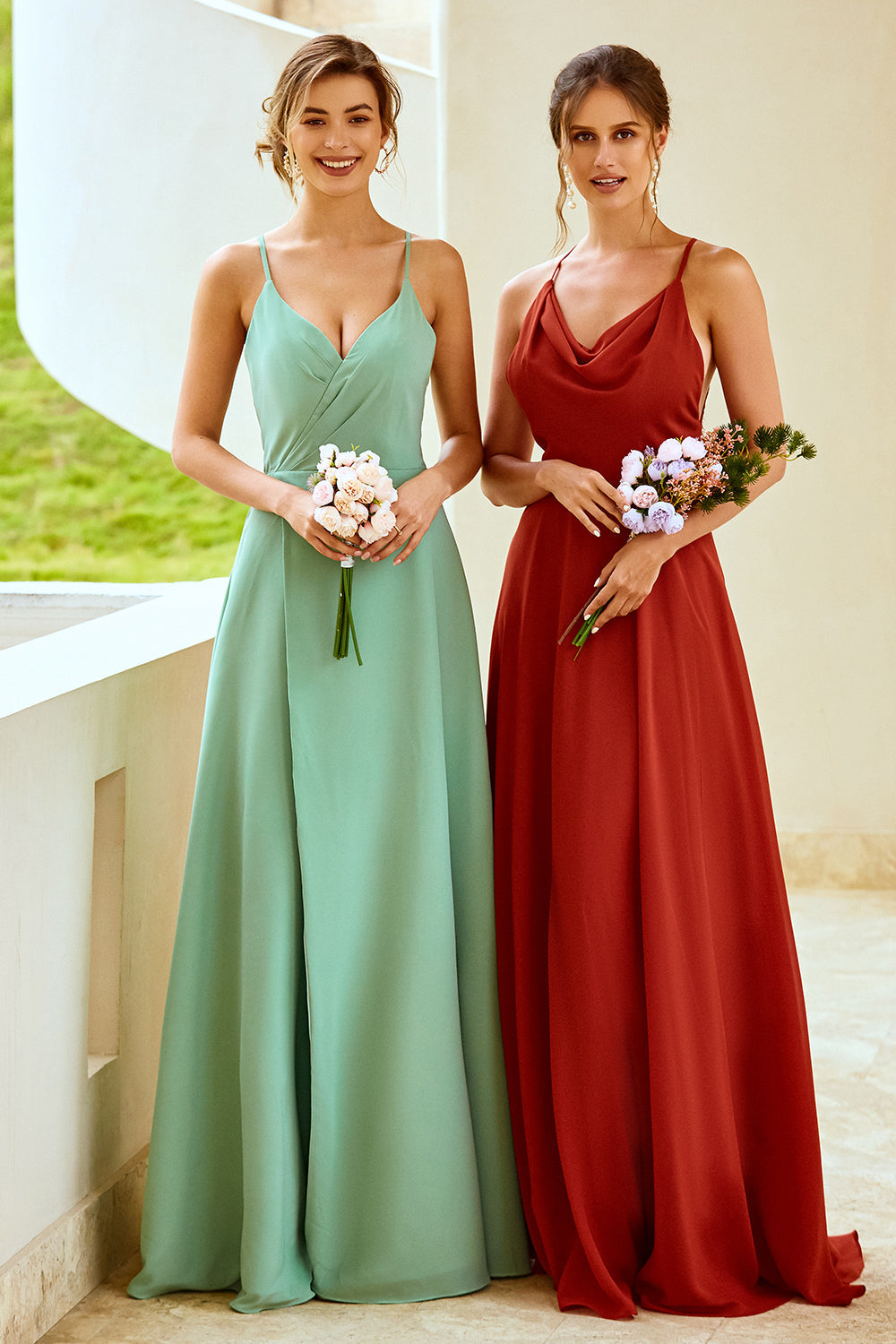Rust Red Spaghetti Straps Long Bridesmaid Dress