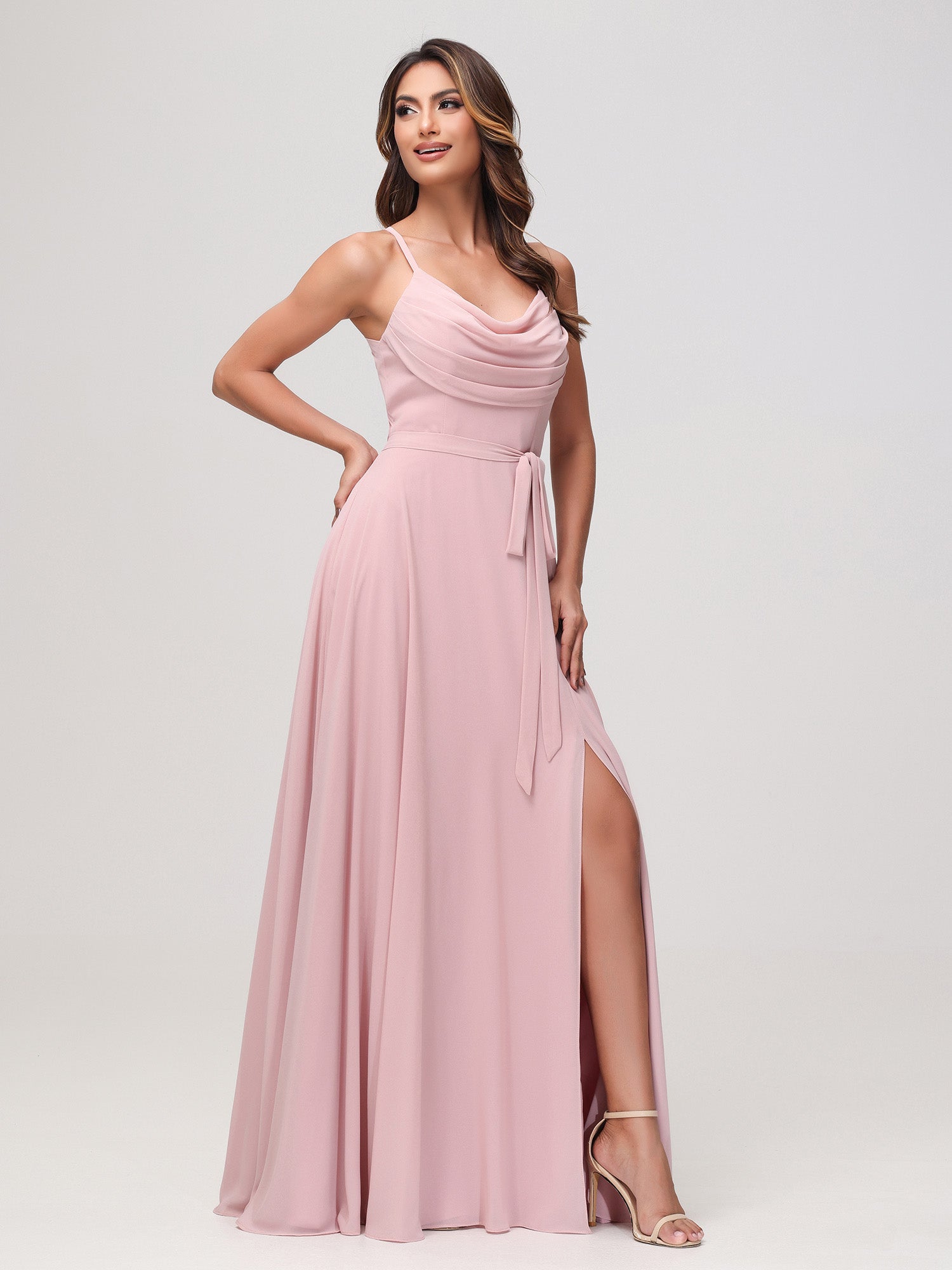 Sexy Cowl Neck Ruched Chiffon Long Dress with Slit Dusty Rose