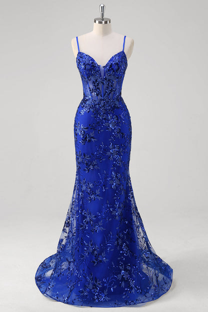 Sparkly Mermaid Royal Blue Spaghetti Straps Corset Sequin Long Prom Dress with Embroidery