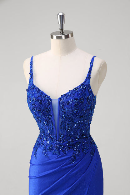 Sparkly Royal Blue Mermaid Applique Spaghetti Straps Long Prom Dress with Slit