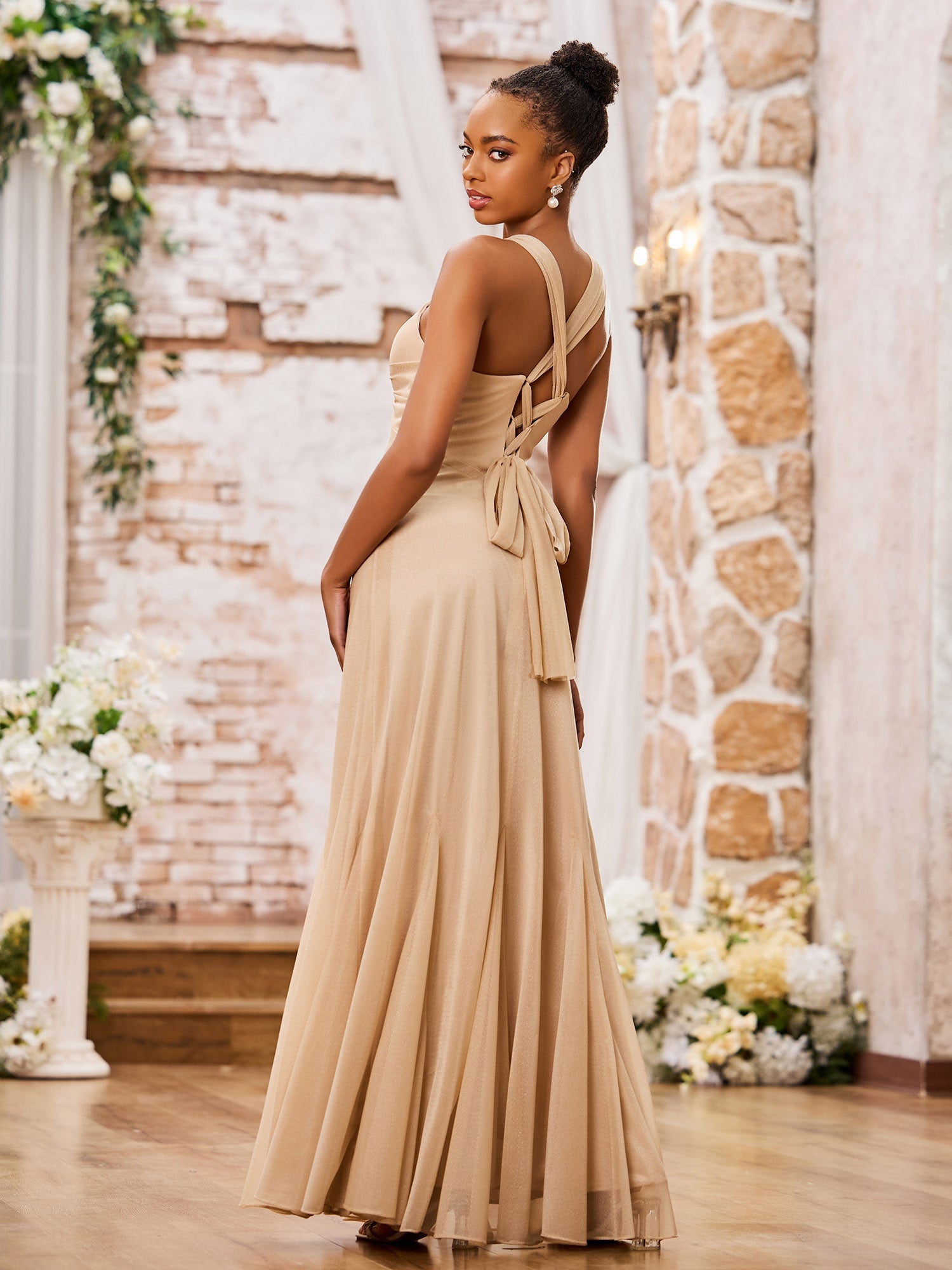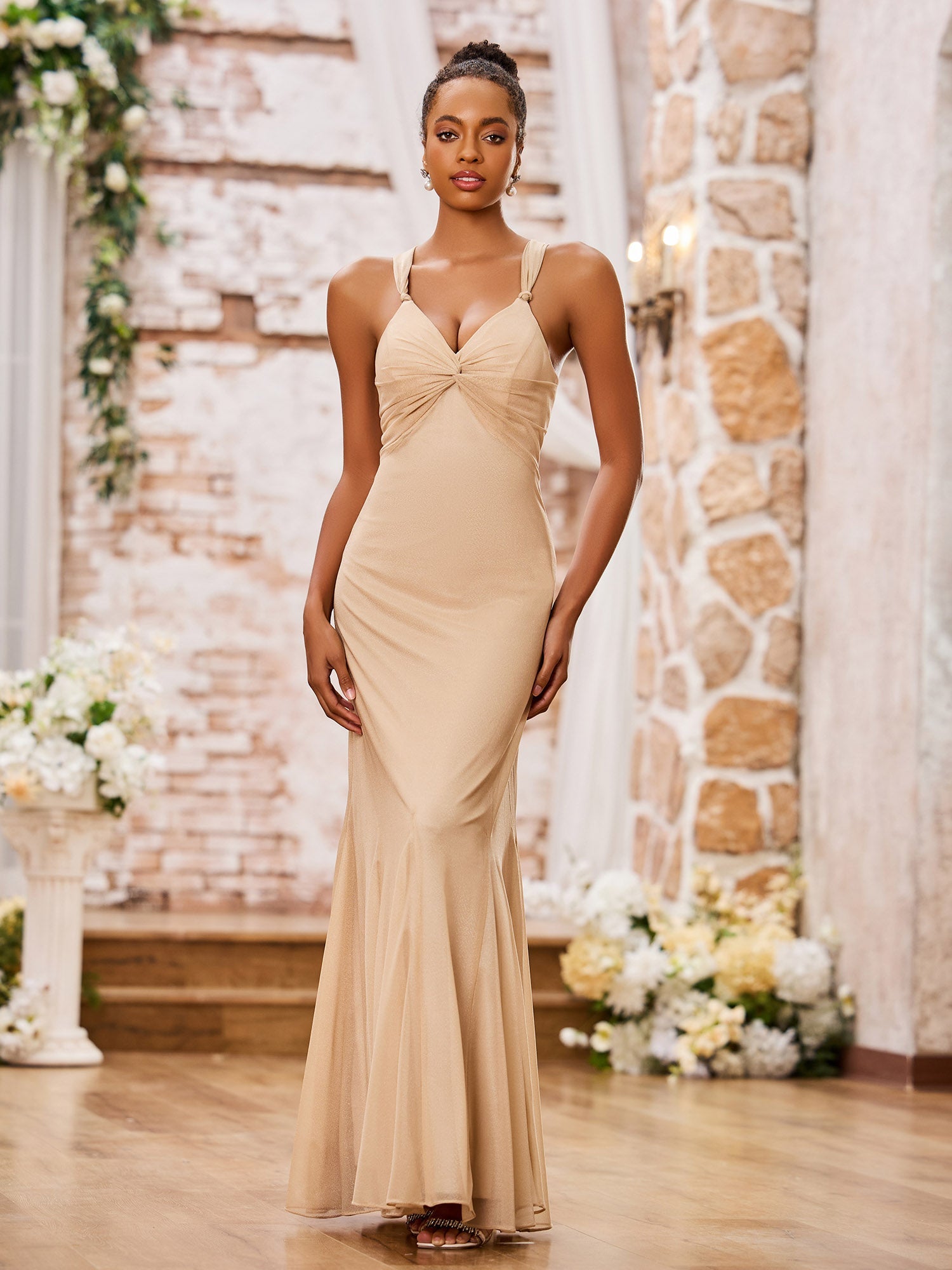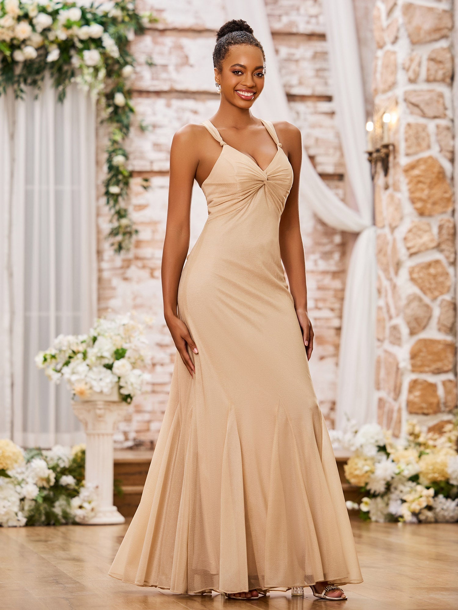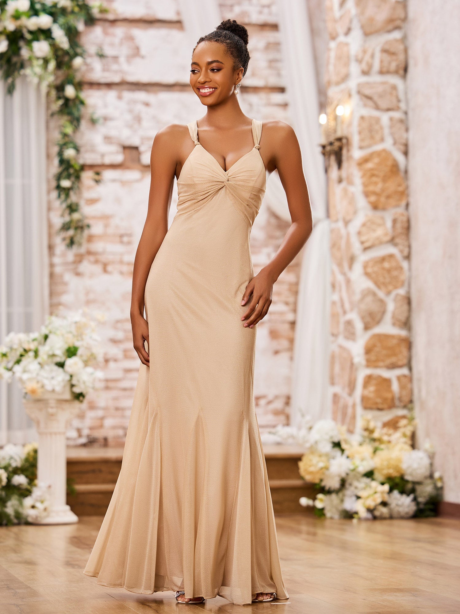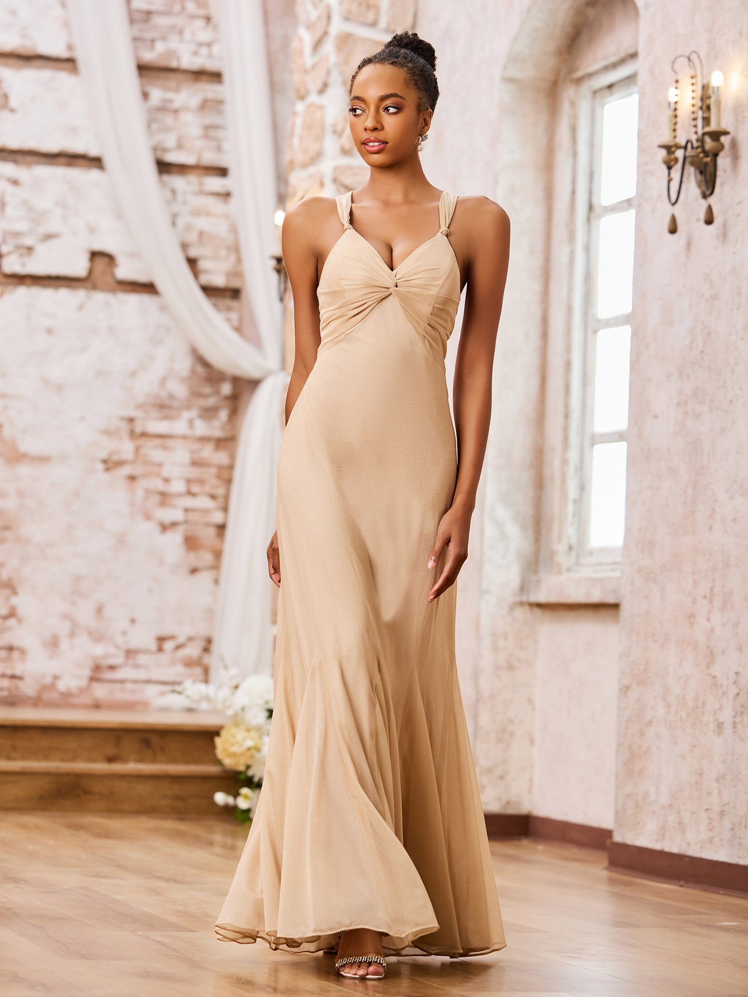 V-Neck Slim Ruched Floor-Length Bridesmaid Dresses Champagne
