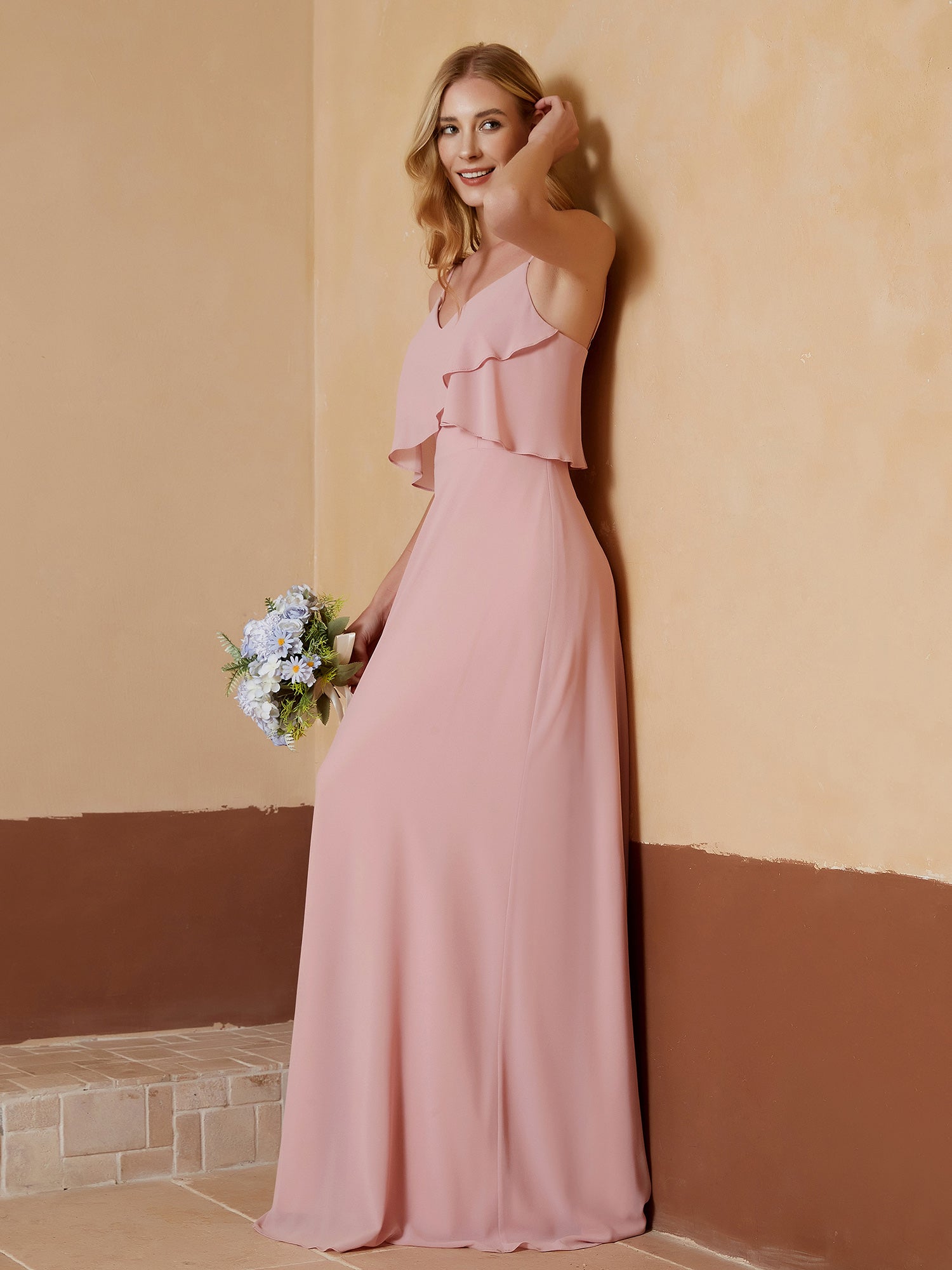 V-neck Spaghetti Straps Ruffles Chiffon A-line Dress Dusty Rose