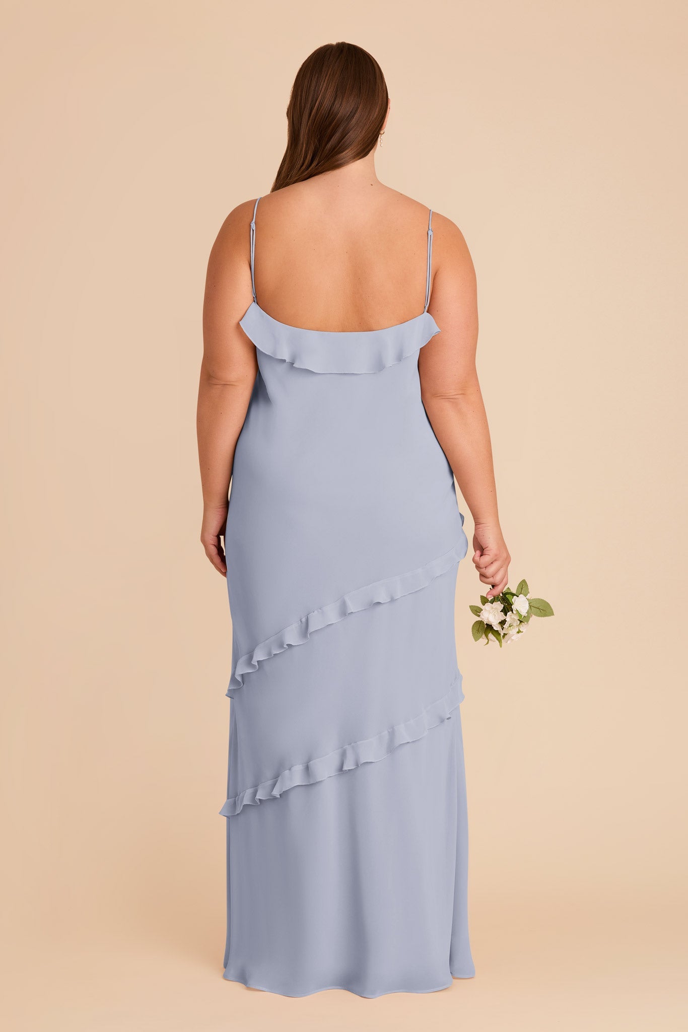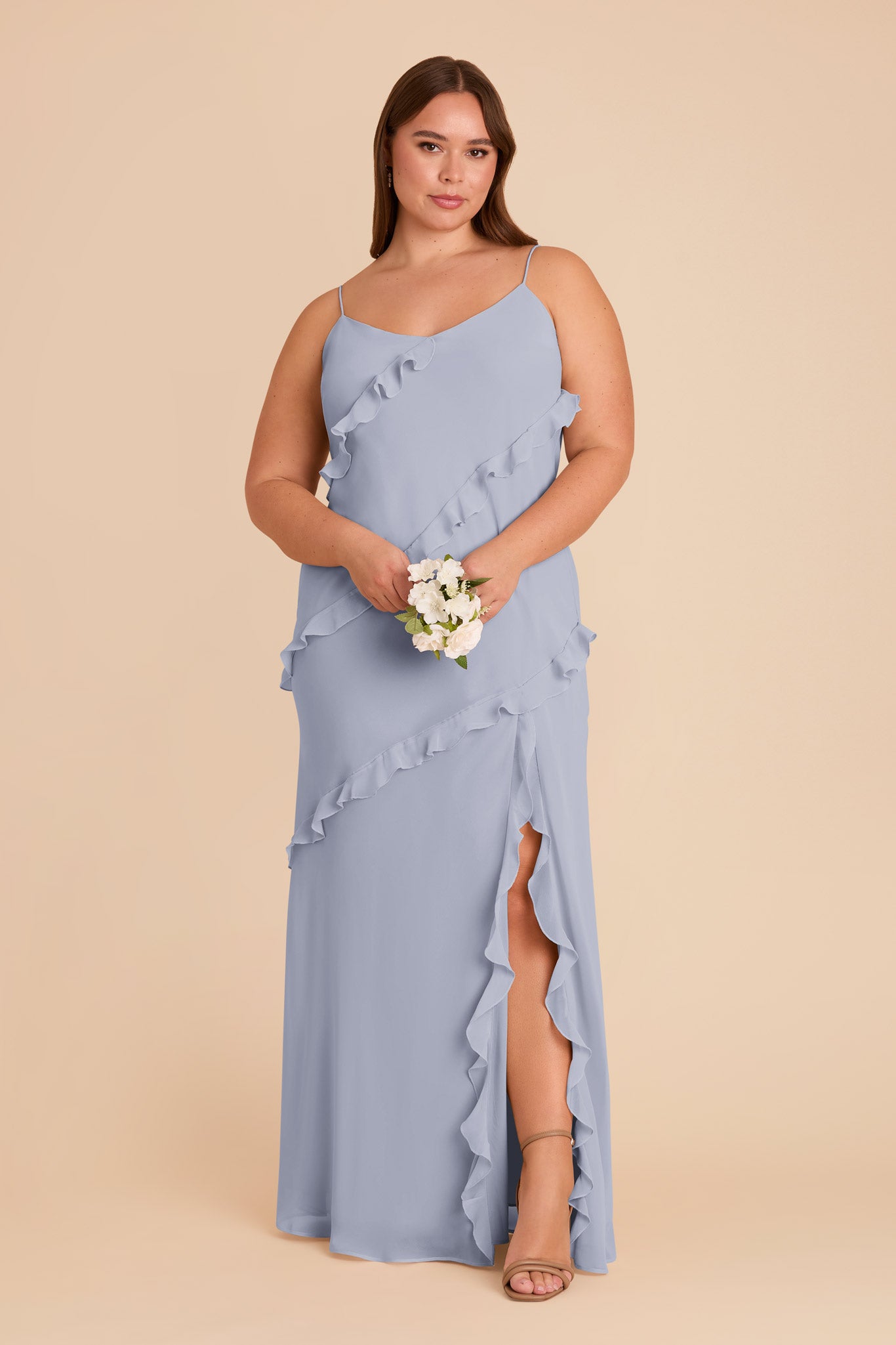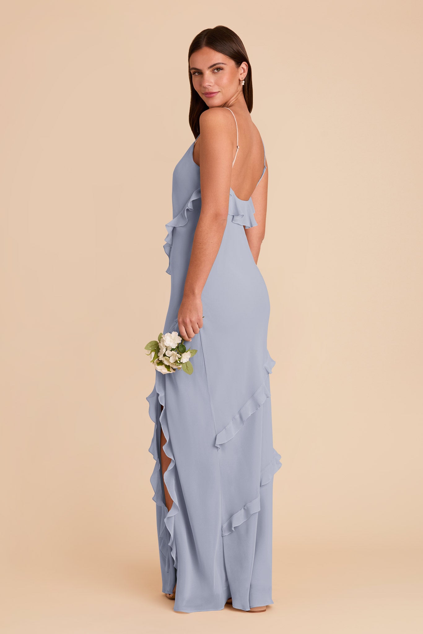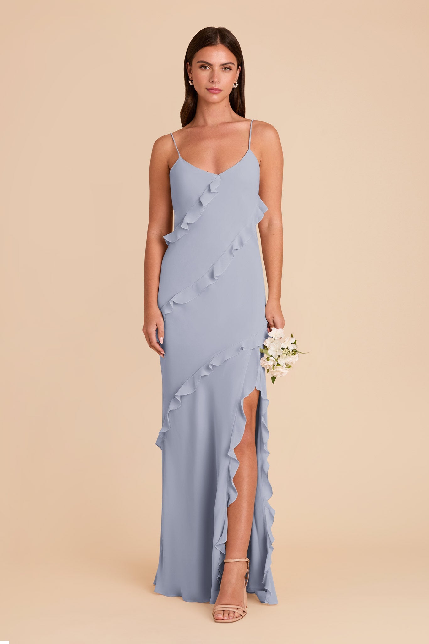 • A floor length V-neck slip dress with romantic ruffles